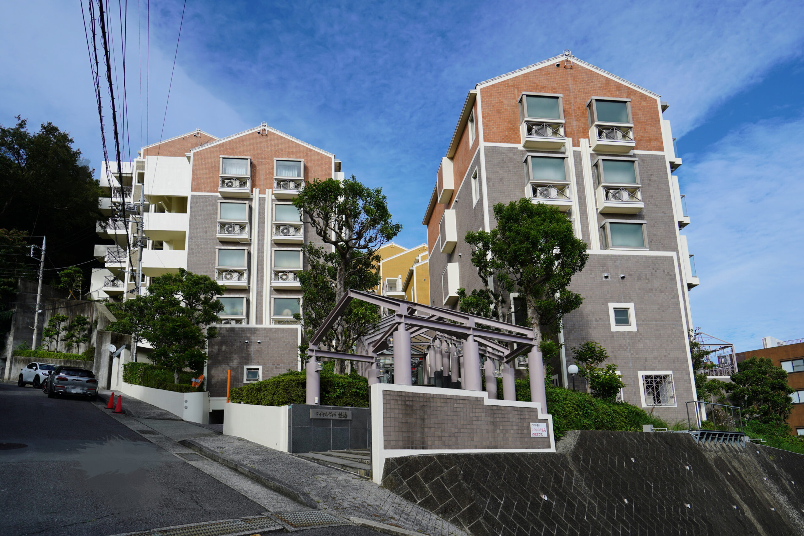 自然豊かな立地に段々に建つ、三角屋根が連なったリゾートマンション。なんと、こちら建築デザイン賞を受賞した建物なんです。
