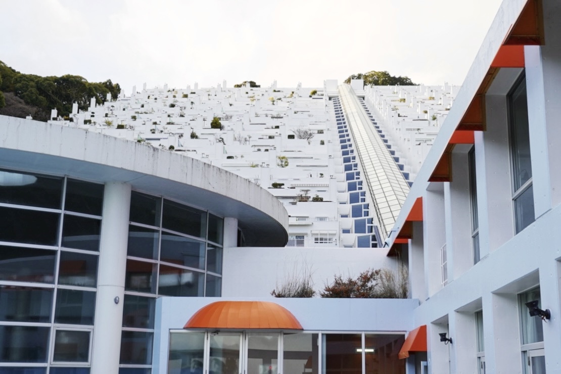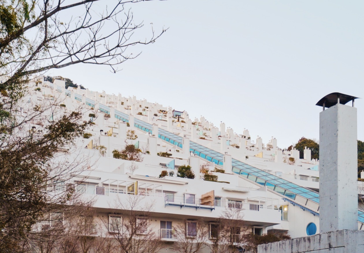 騙し絵のような、テーマパークのような、SFのセットのような……。見れば見るほど「え? ここ住める家なの?」と疑いたくなる佇まいですが、傾斜地(約28度)に沿って建てられた大規模マンションなんです。