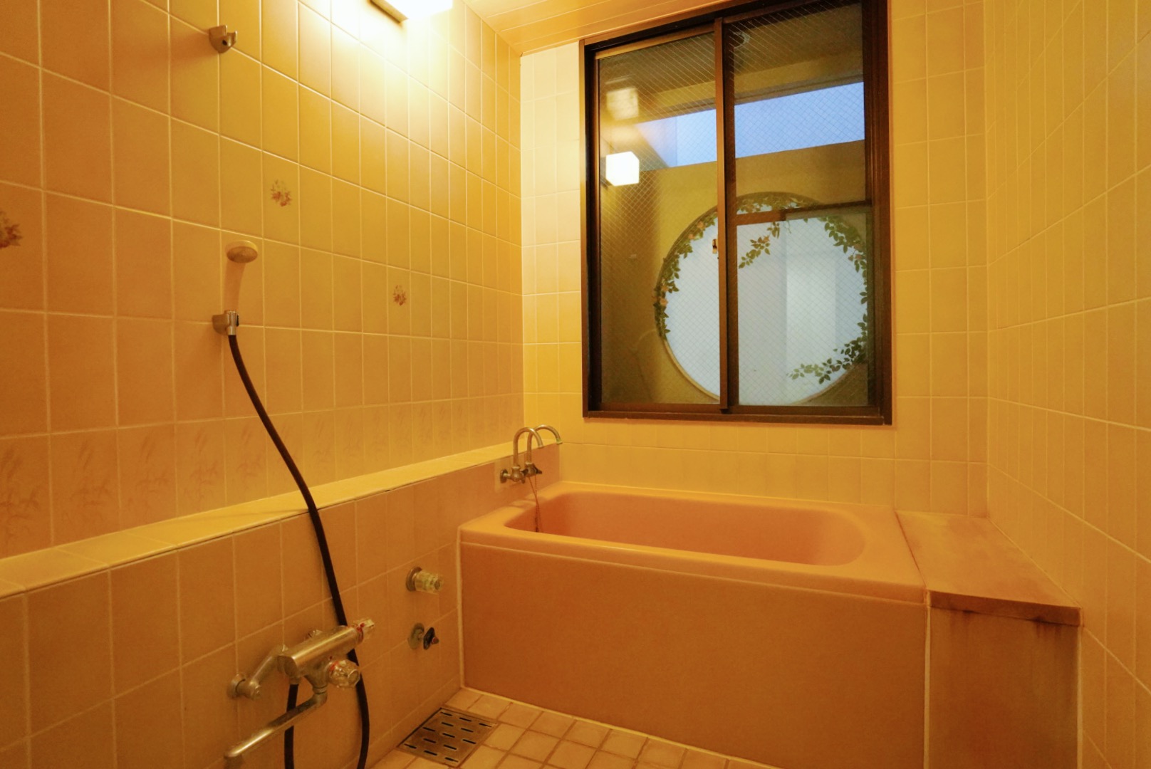 お風呂は花柄のタイルと薄桃色の浴槽がかわいい温かみのある空間。