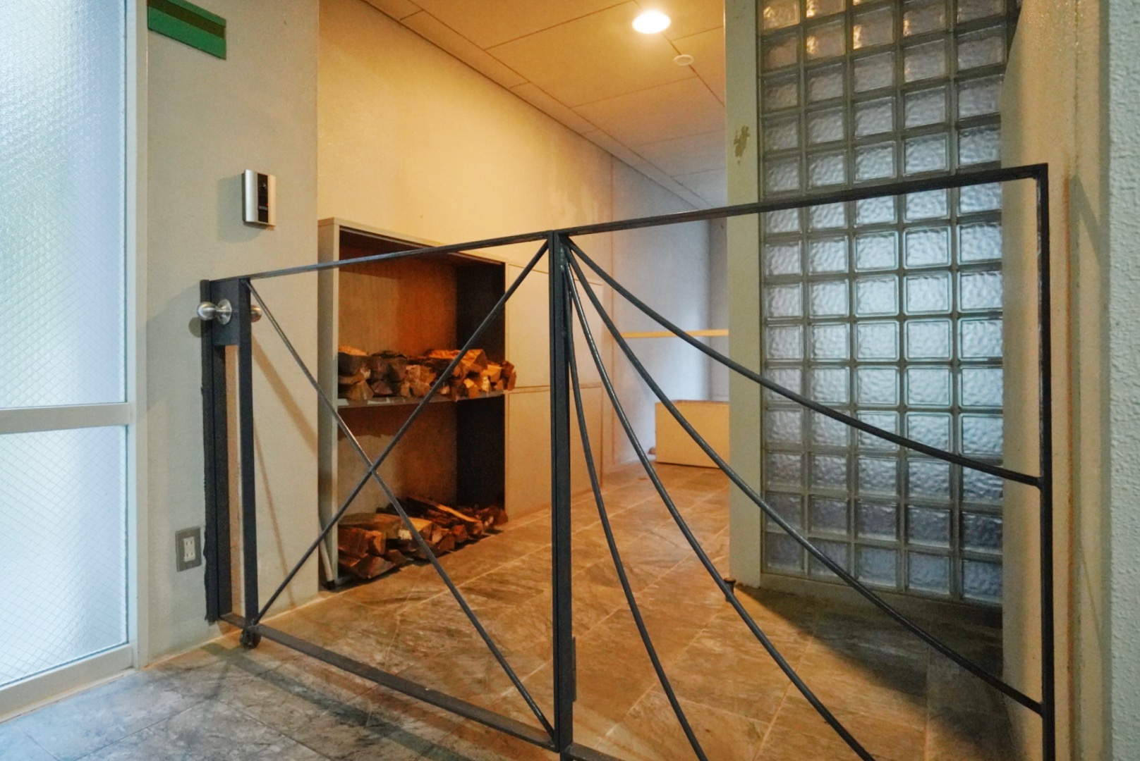 玄関の壁はガラスのタイルと、すりガラスになっています。大きなドレッサーが置いてあってもまだゆとりがある広さ。壁沿いにシューズラックを置くのも良さそうです。