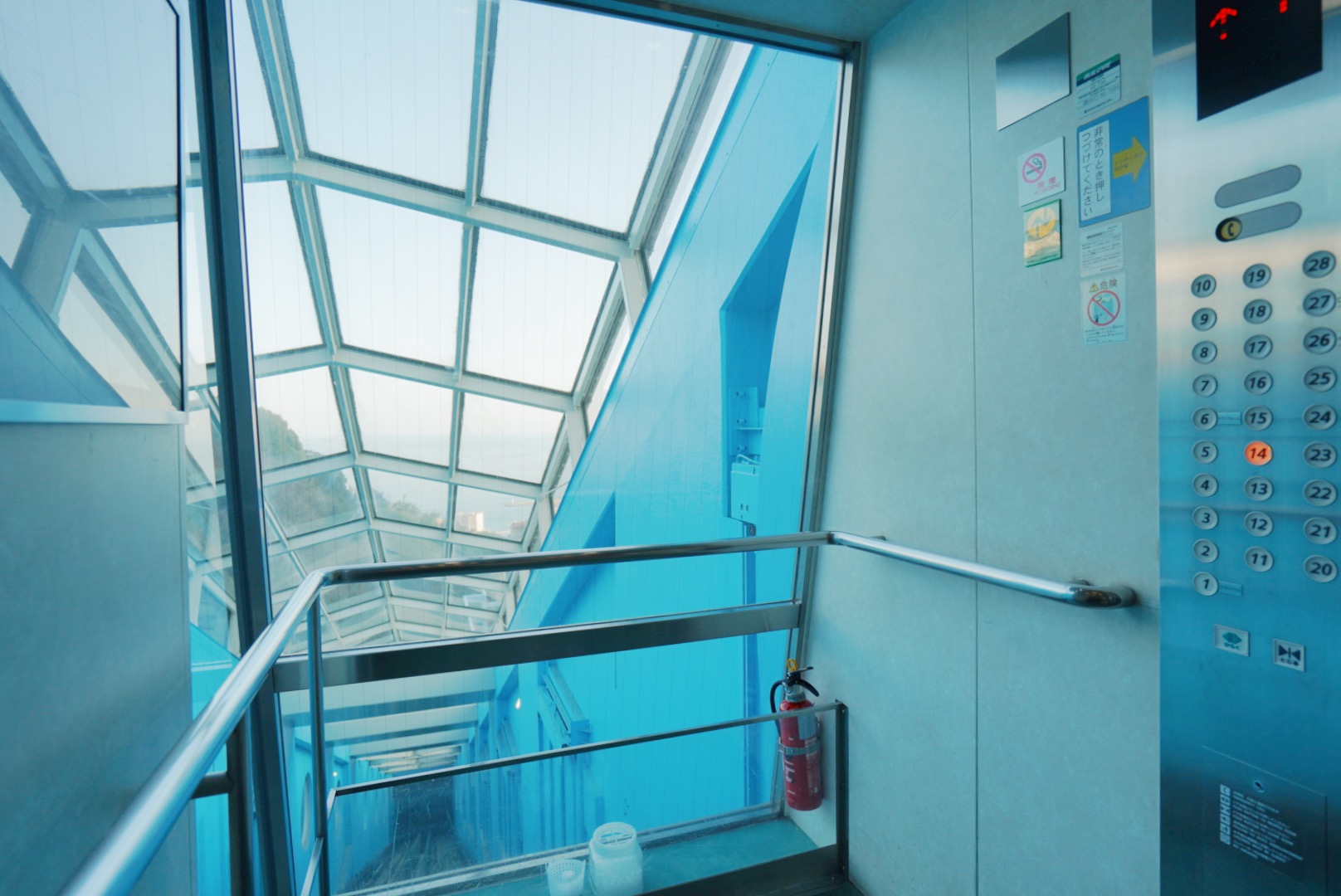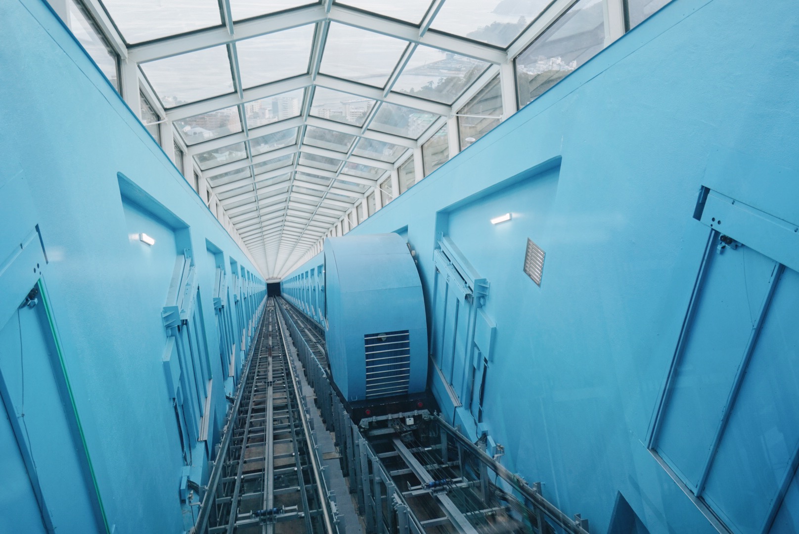 マンションには斜行エレベーターが設けられており、まるでケーブルカーに乗っているような気分になります。上昇するときにはなんと海も望めます。