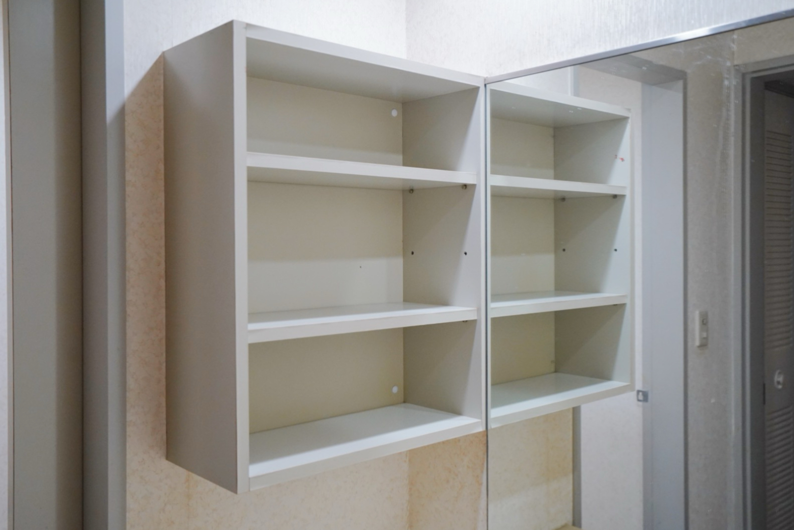 そして鏡の左横にも収納棚が。毎日使うスキンケア用品や化粧品置き場に。