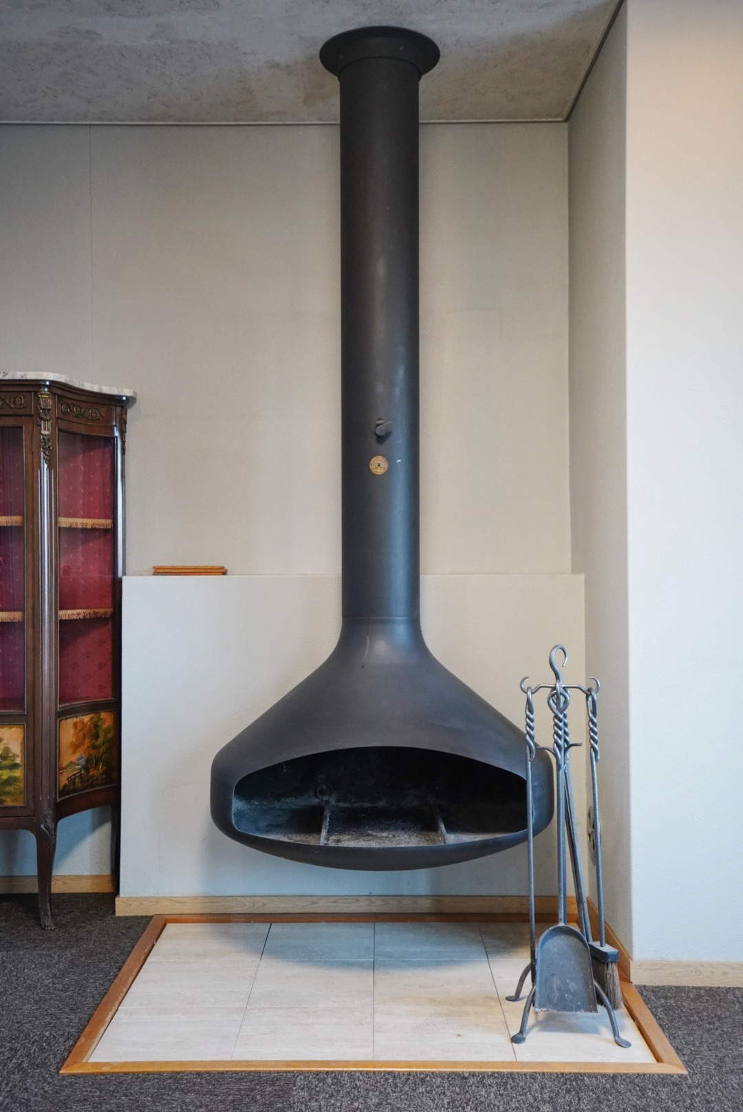 こちらはなんと、フランスから船でやってきた暖炉なんです。よく見ると、暖炉の下は高熱に耐えられるタイル仕様になっています。どこか生き物のようなフォルムで、この空間の象徴的な存在になっています。