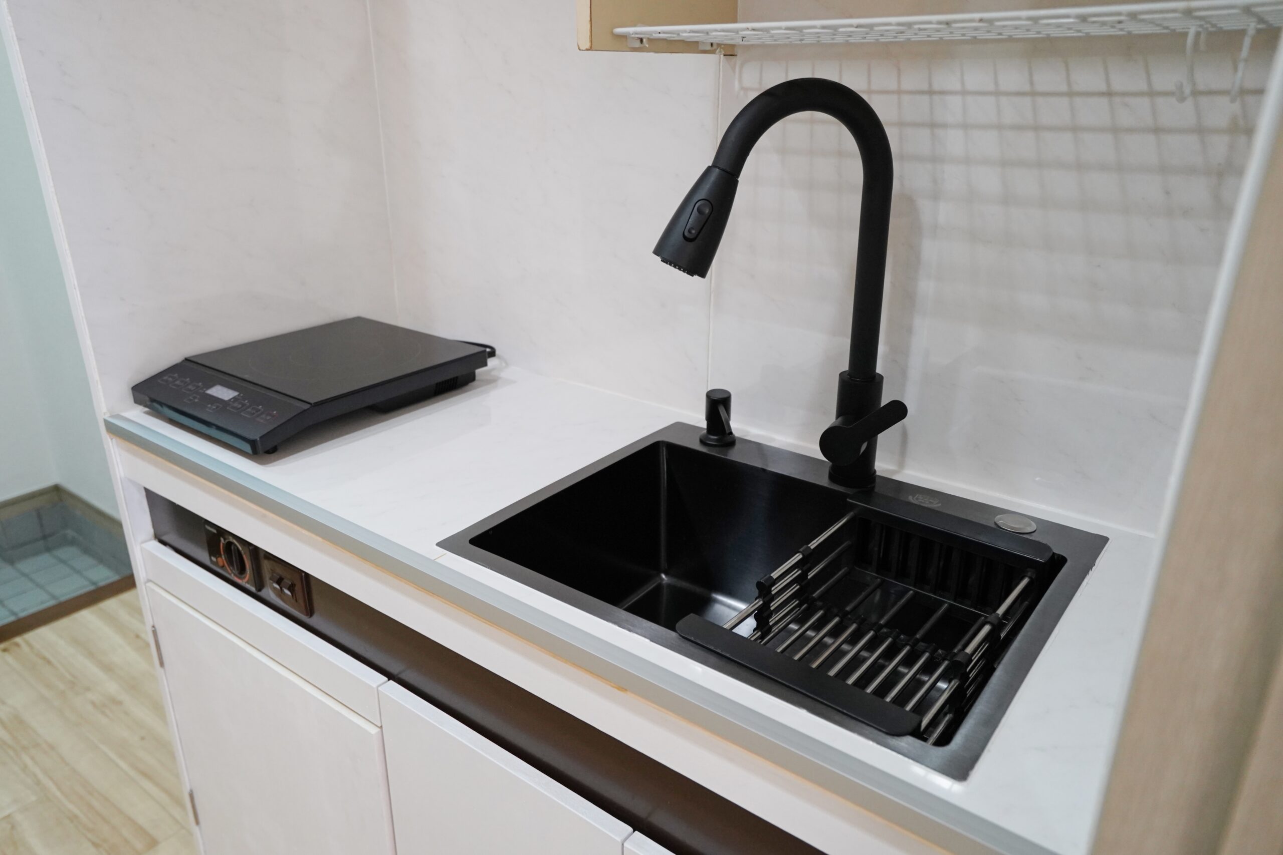 比較的にコンパクトサイズなキッチンですが、しっかり収納もあり、水栓やシンクは新しいものです。水切りカゴが付いているのもうれしい。