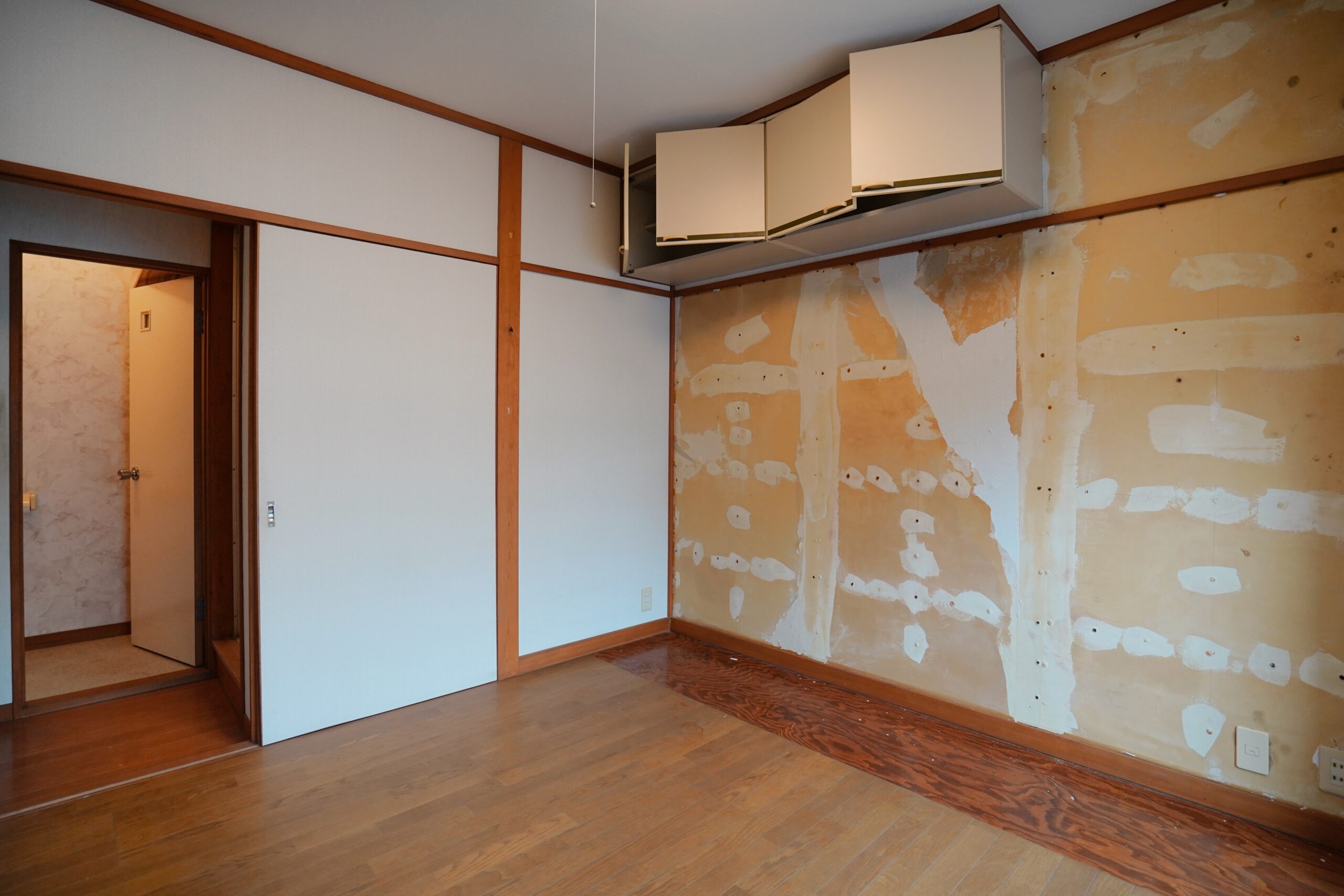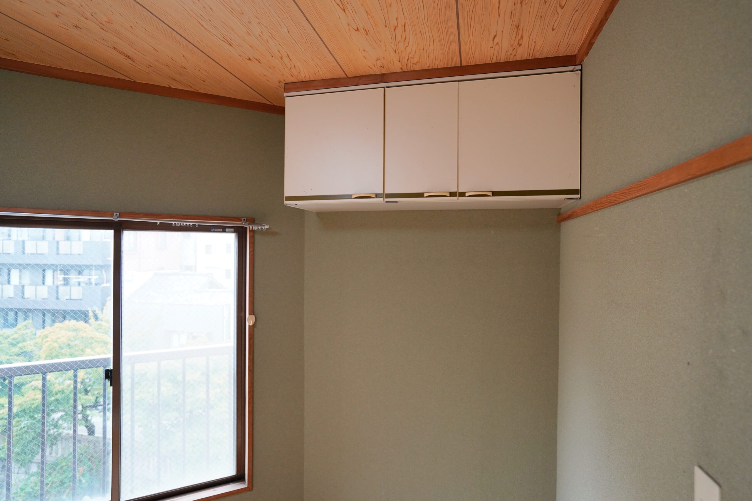 こちらのお部屋には吊戸棚と、スライド扉の大きめ収納。