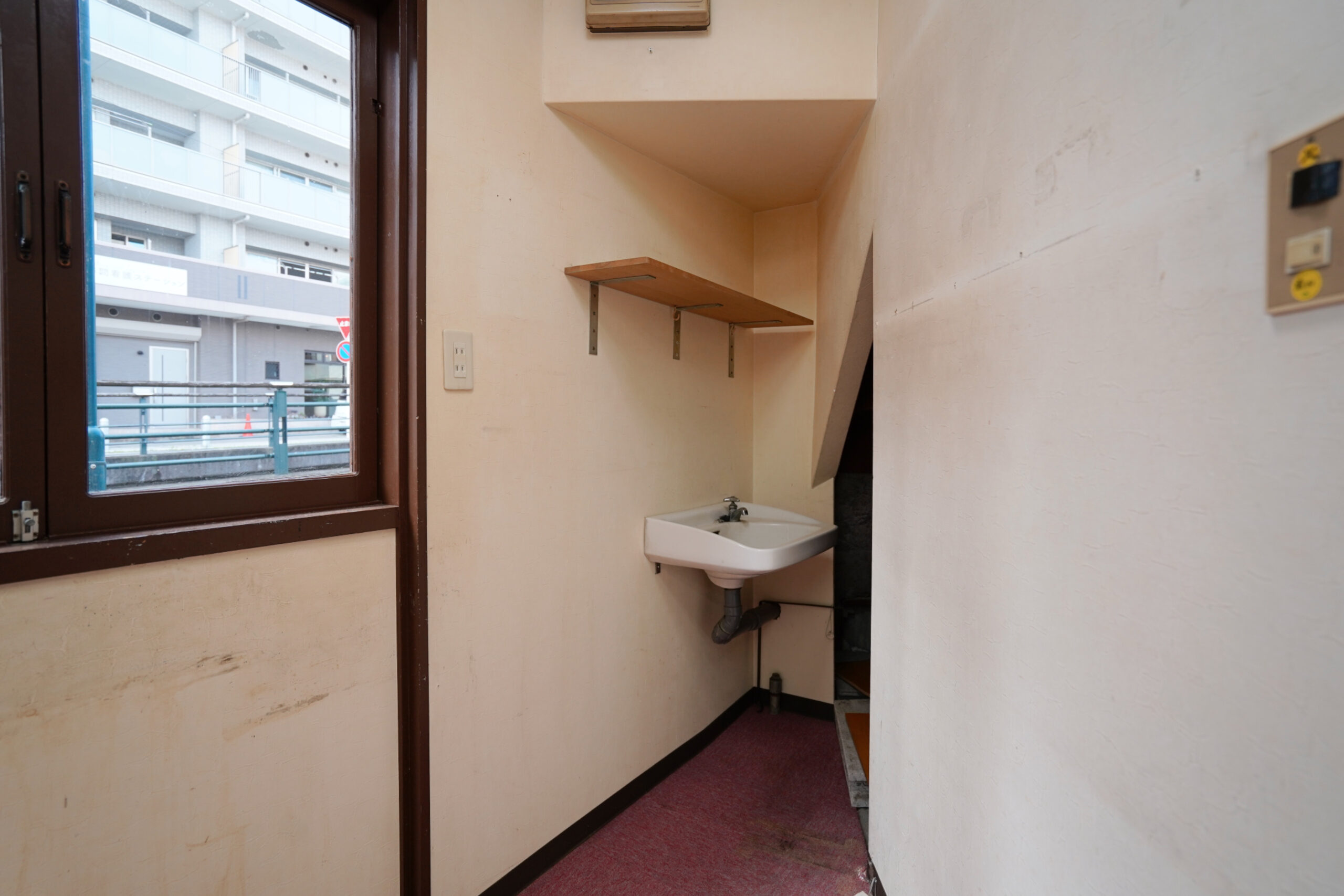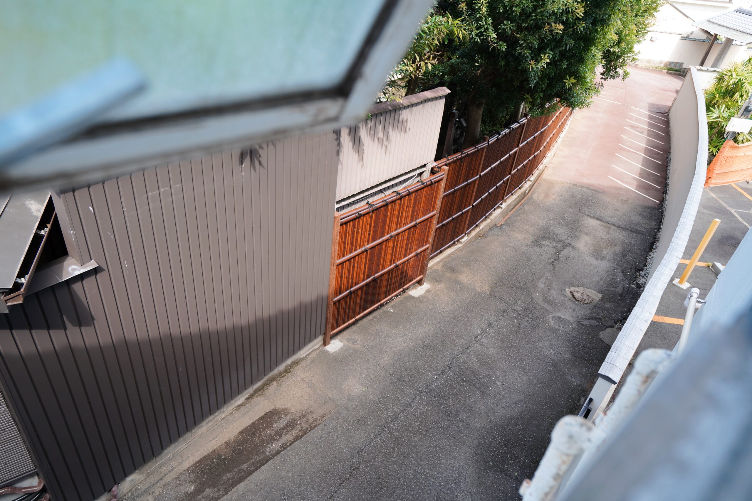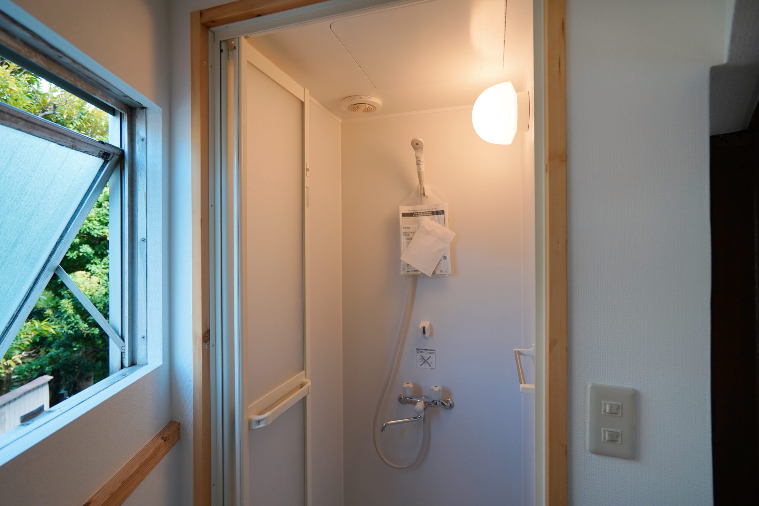 隣に滑り出し窓があって、シャワールームの湿気を逃がしやすいのが良いですね。窓の外には細い小道が続いています。