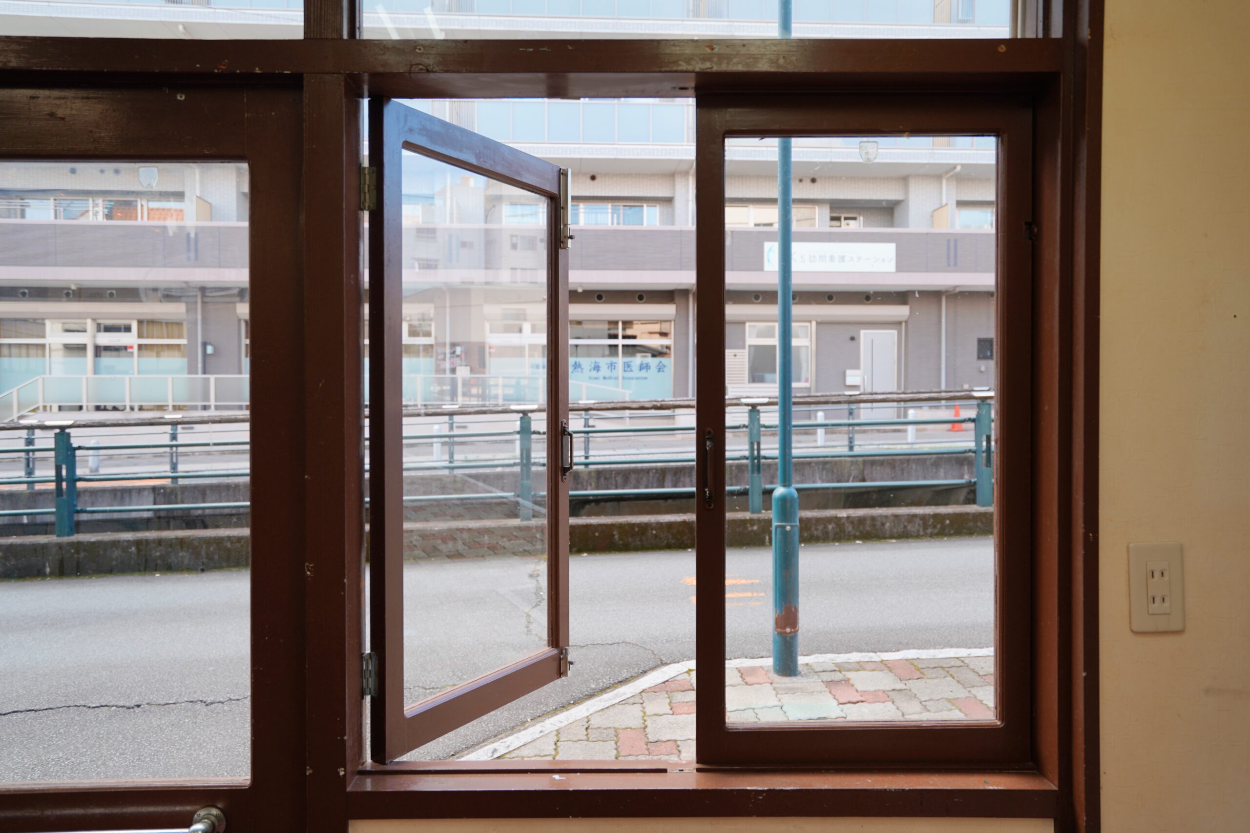 窓から見えるのは、車と人の行き交う初川沿いの道。