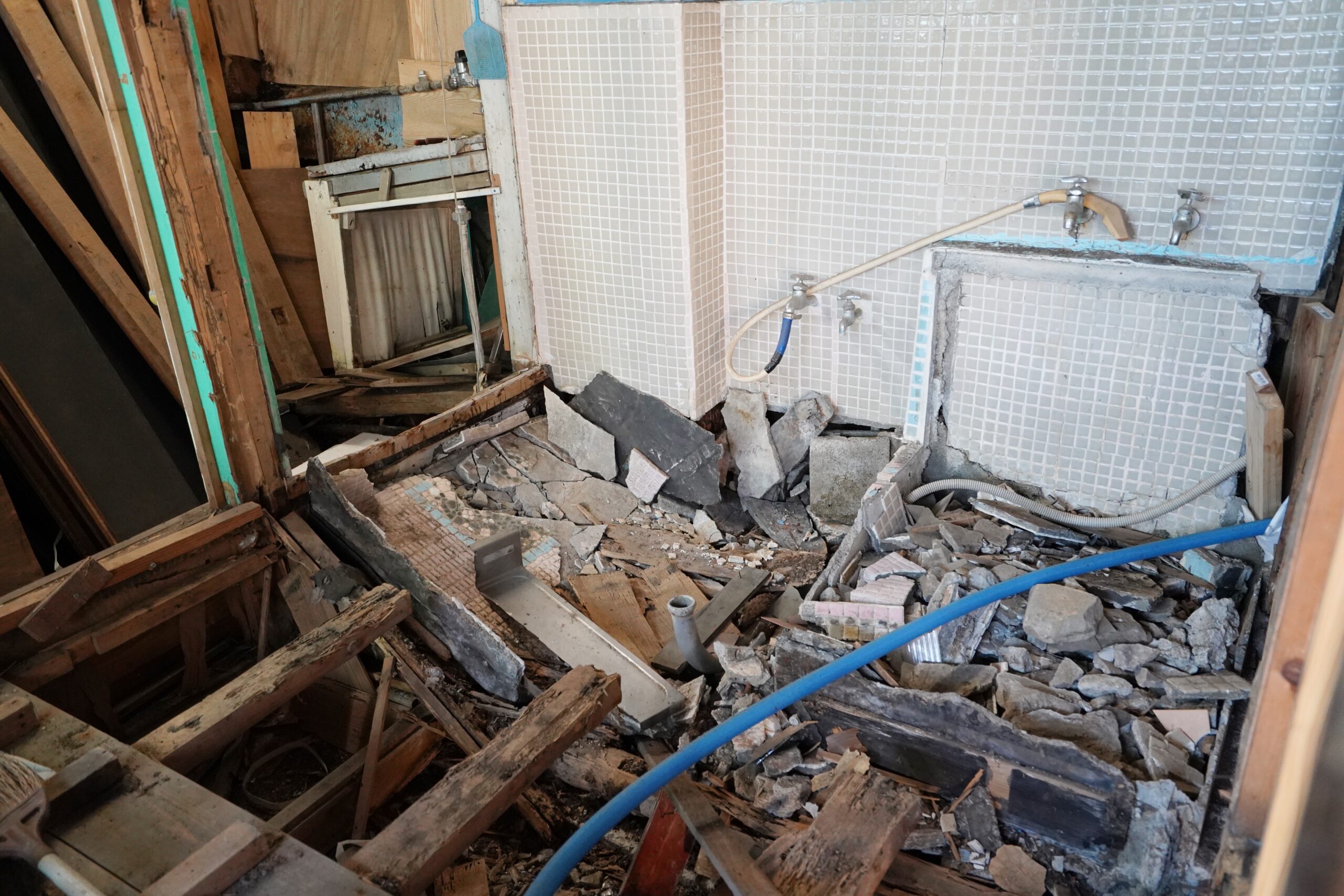 ・水道管、排水の引込を現状では隣地所有者宅から一時的に繋げて使用中、別で繋ぎ直す必要あり