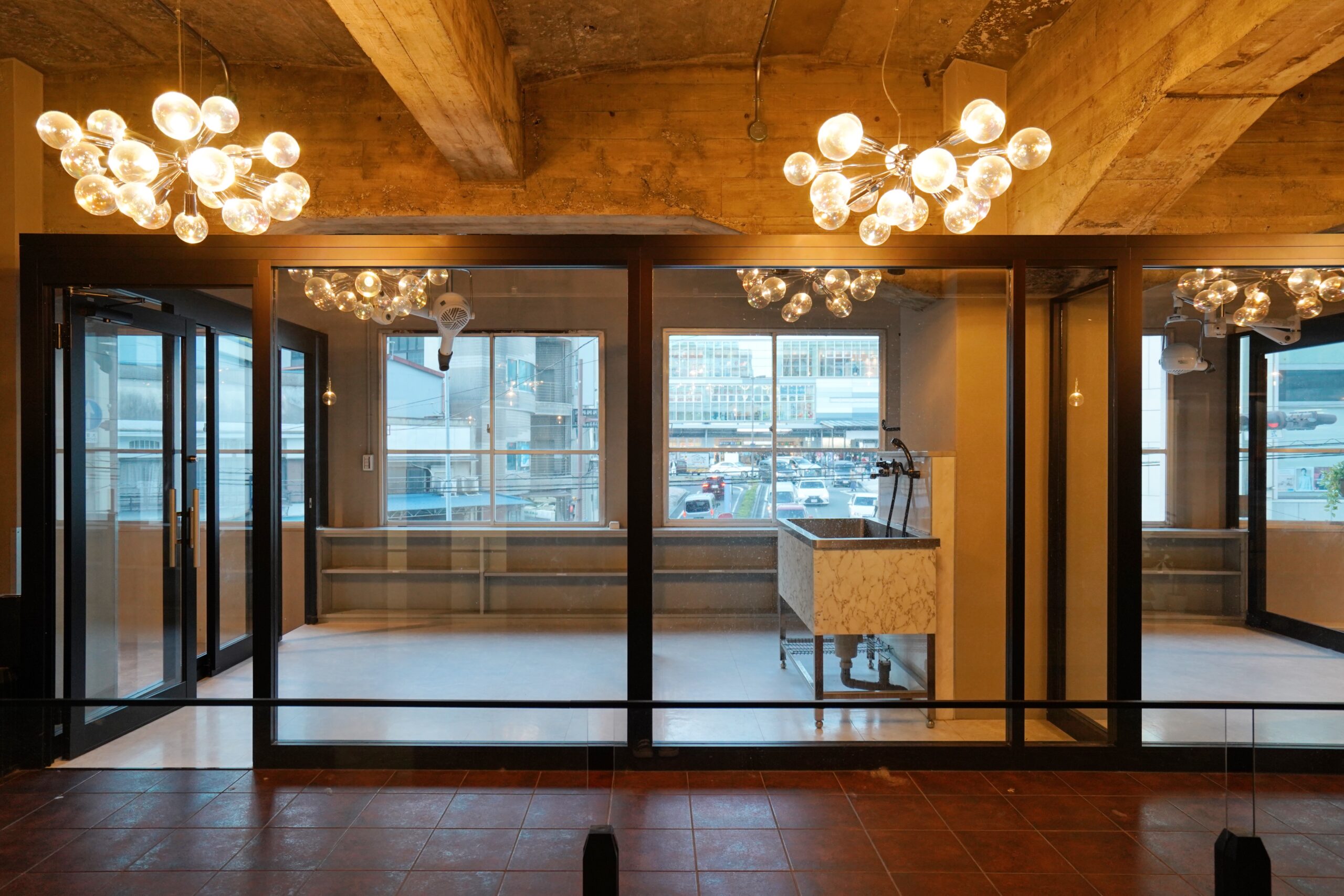 右手にはゲートを通った先、トリミングサロンの面影を残すガラス張りの個室が2つ。