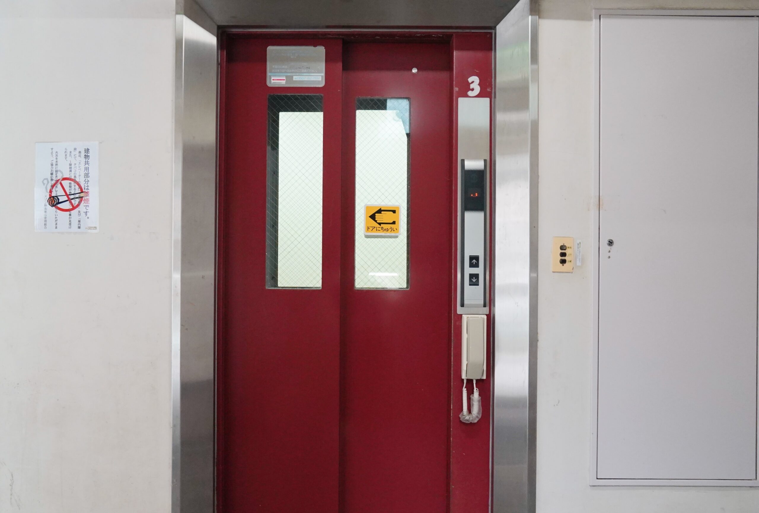 赤色の扉のエレベーターは、ロンドンの電話ボックスを思い出すような…レトロな愛らしさを感じます。