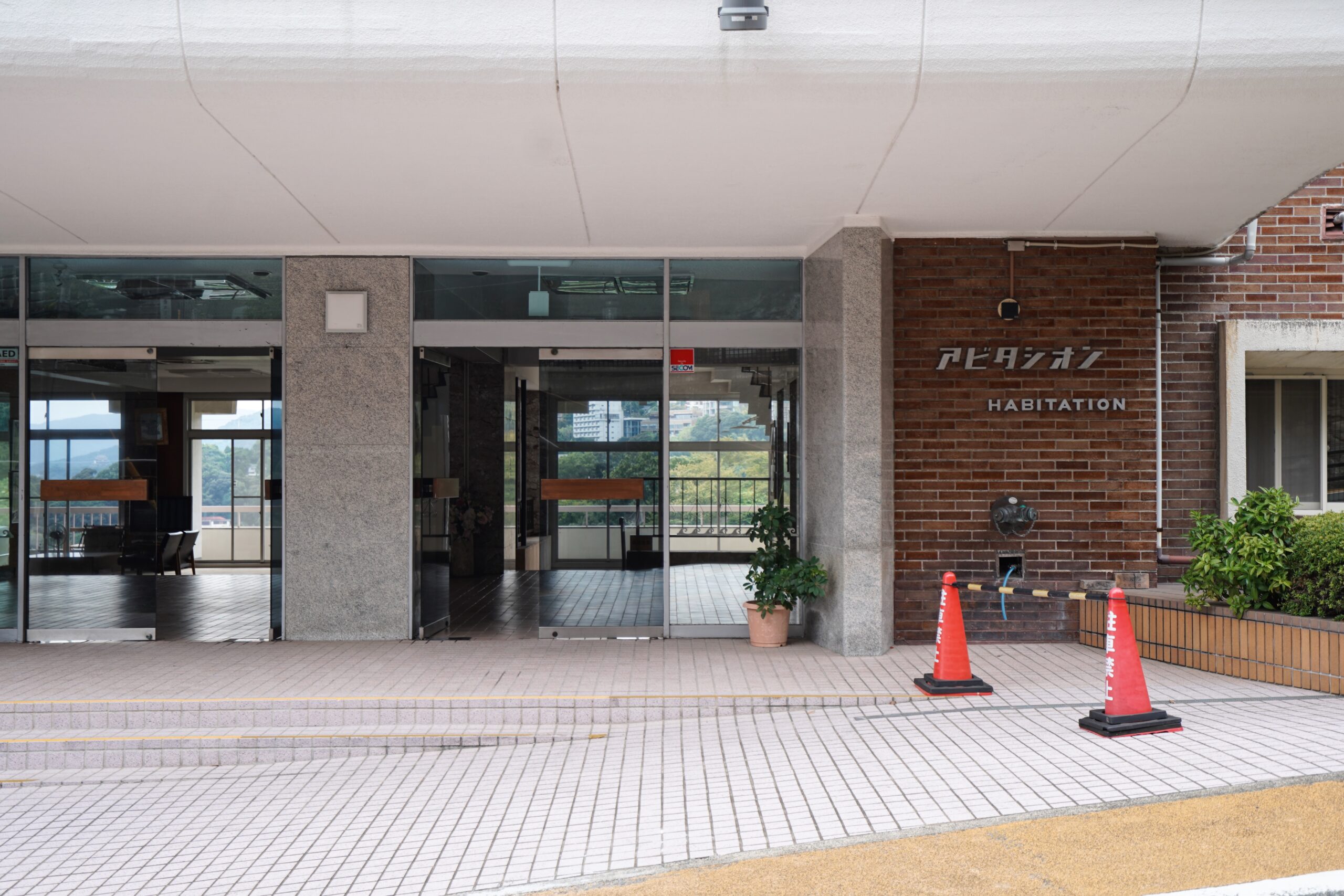 茶色いレンガの外壁に刻まれたマンション名は、レトロモダンなフォント。