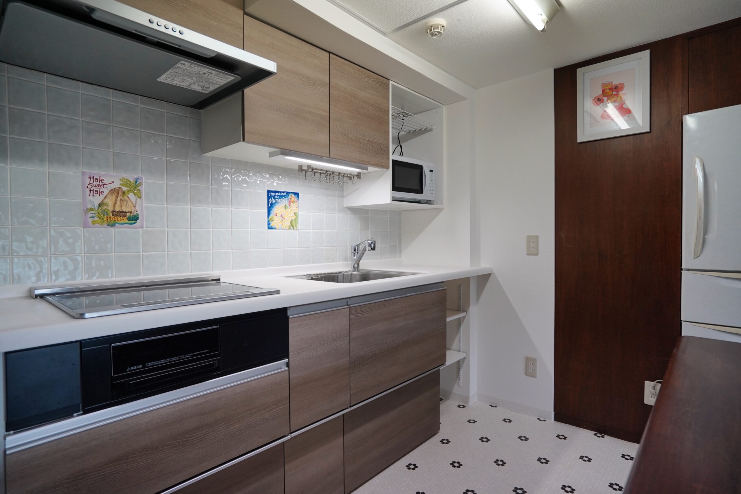 リフォームされた、タイル貼りの清潔感あるキッチンは3口のIHクッキングヒーターで、お料理も楽しめそうです。