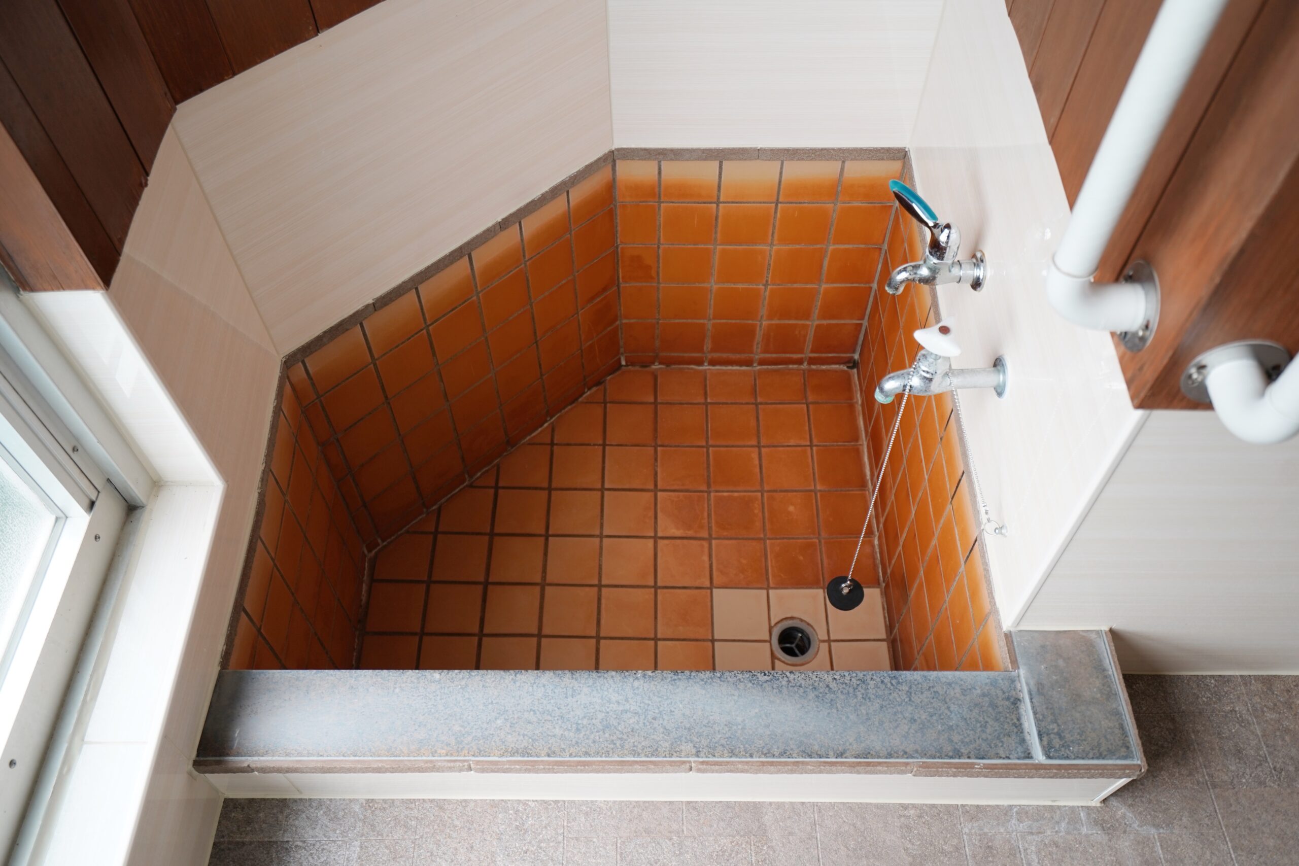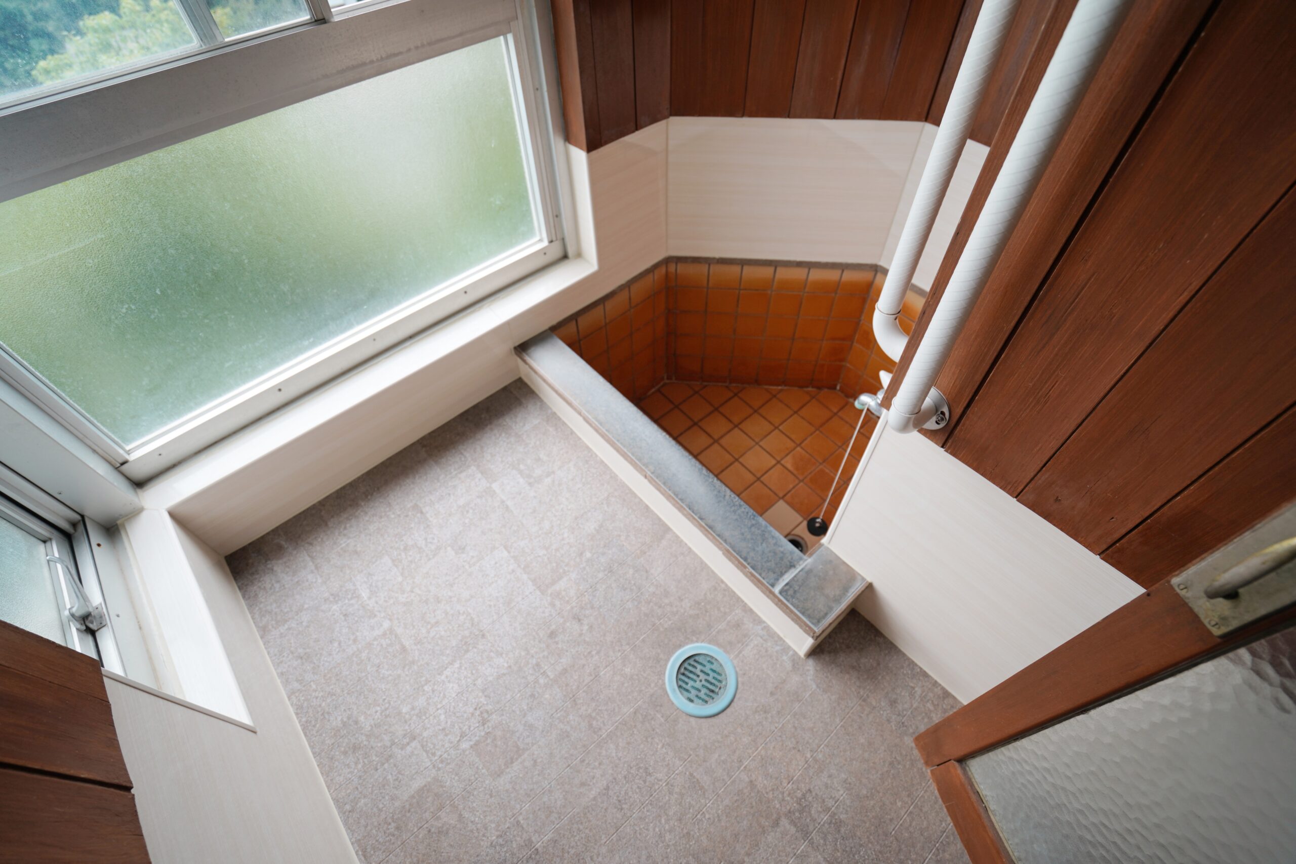脱衣所の先には、飴色のタイルがキュートな五角形の浴槽。