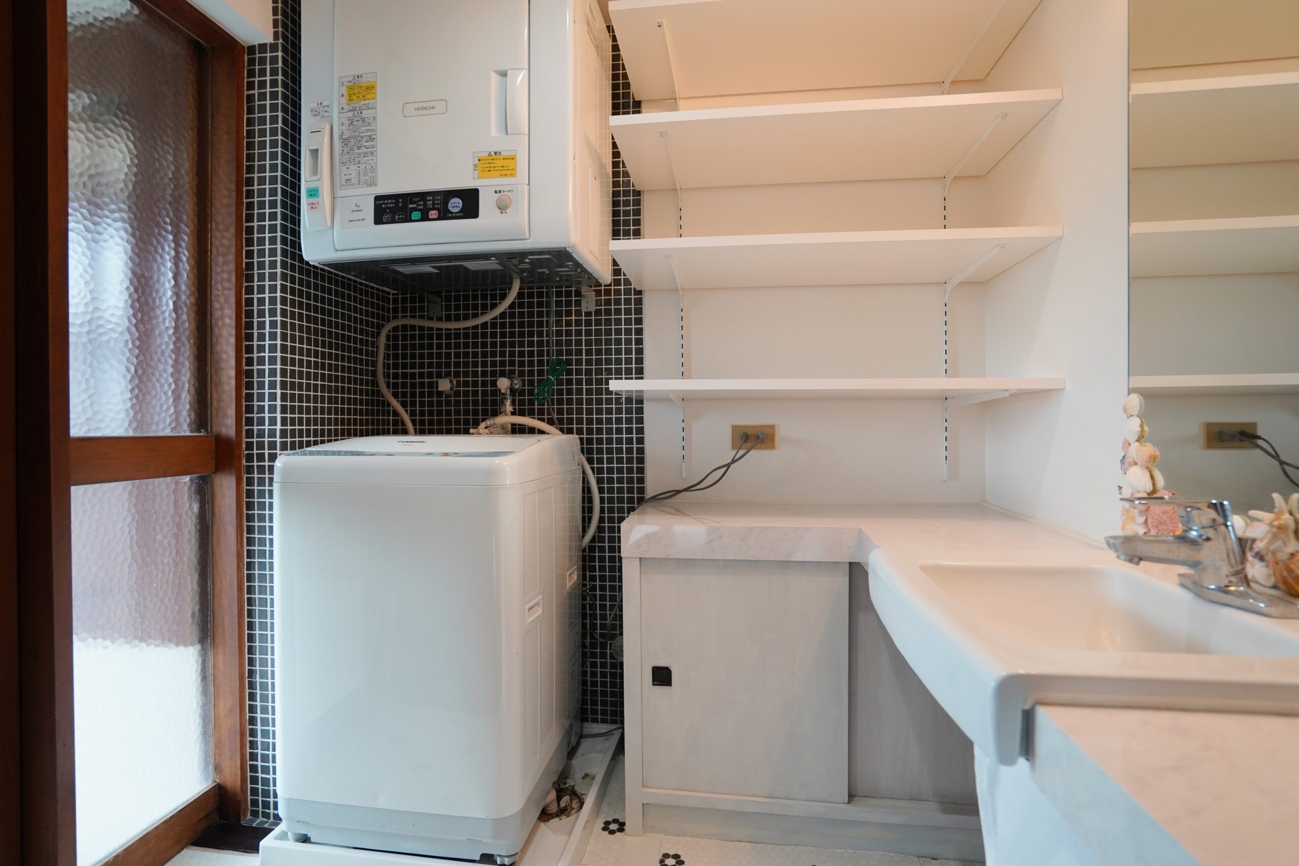 白を貴重としつつ、黒いモザイクタイルがアクセントに。