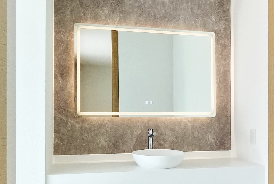独立洗面台には、大きくて横長のLED付き(3色調光可能&曇り止め付き)の鏡が。