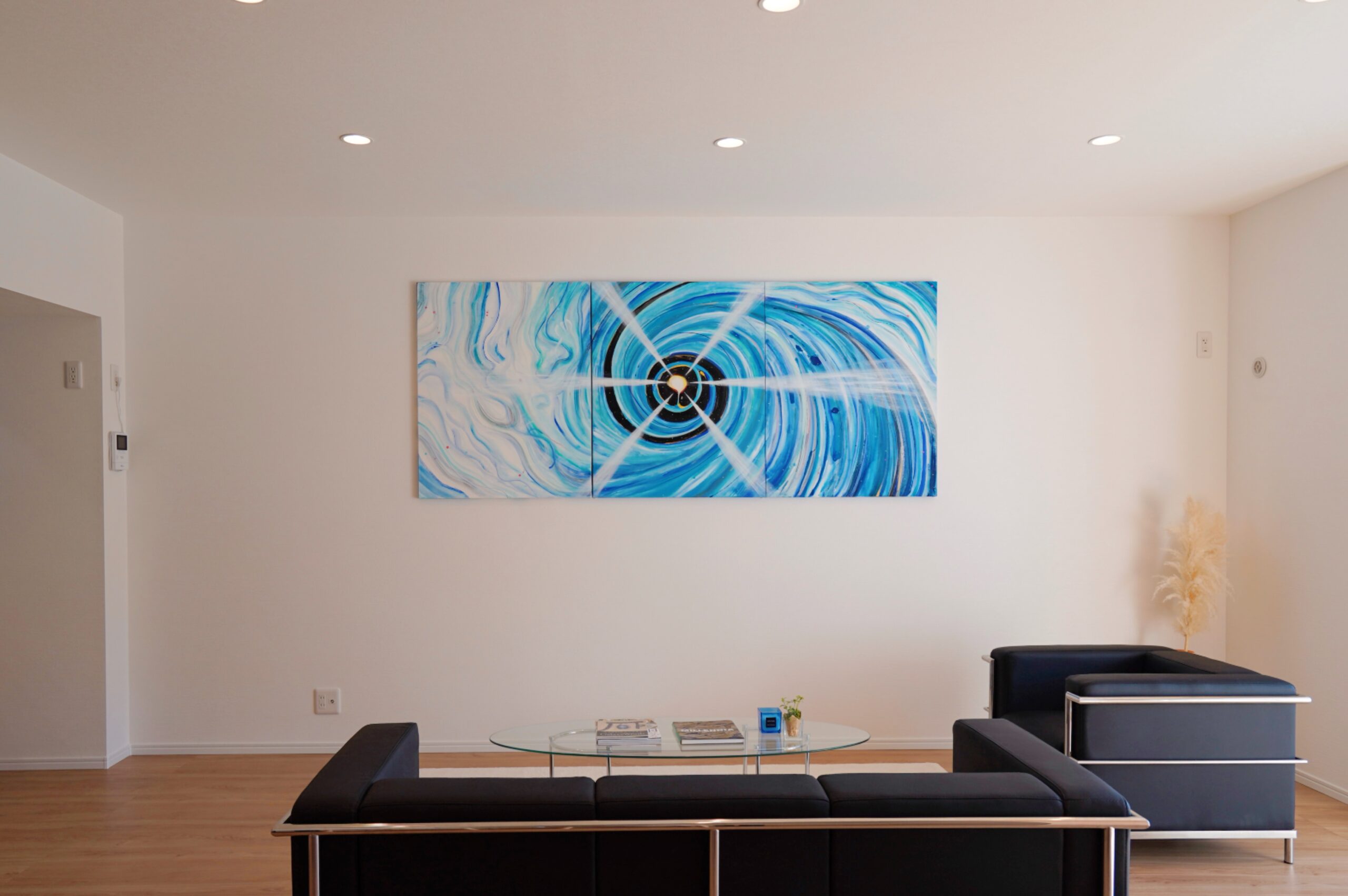 リビングの壁に飾られているのは、現代アーティスト新井文月氏の作品。