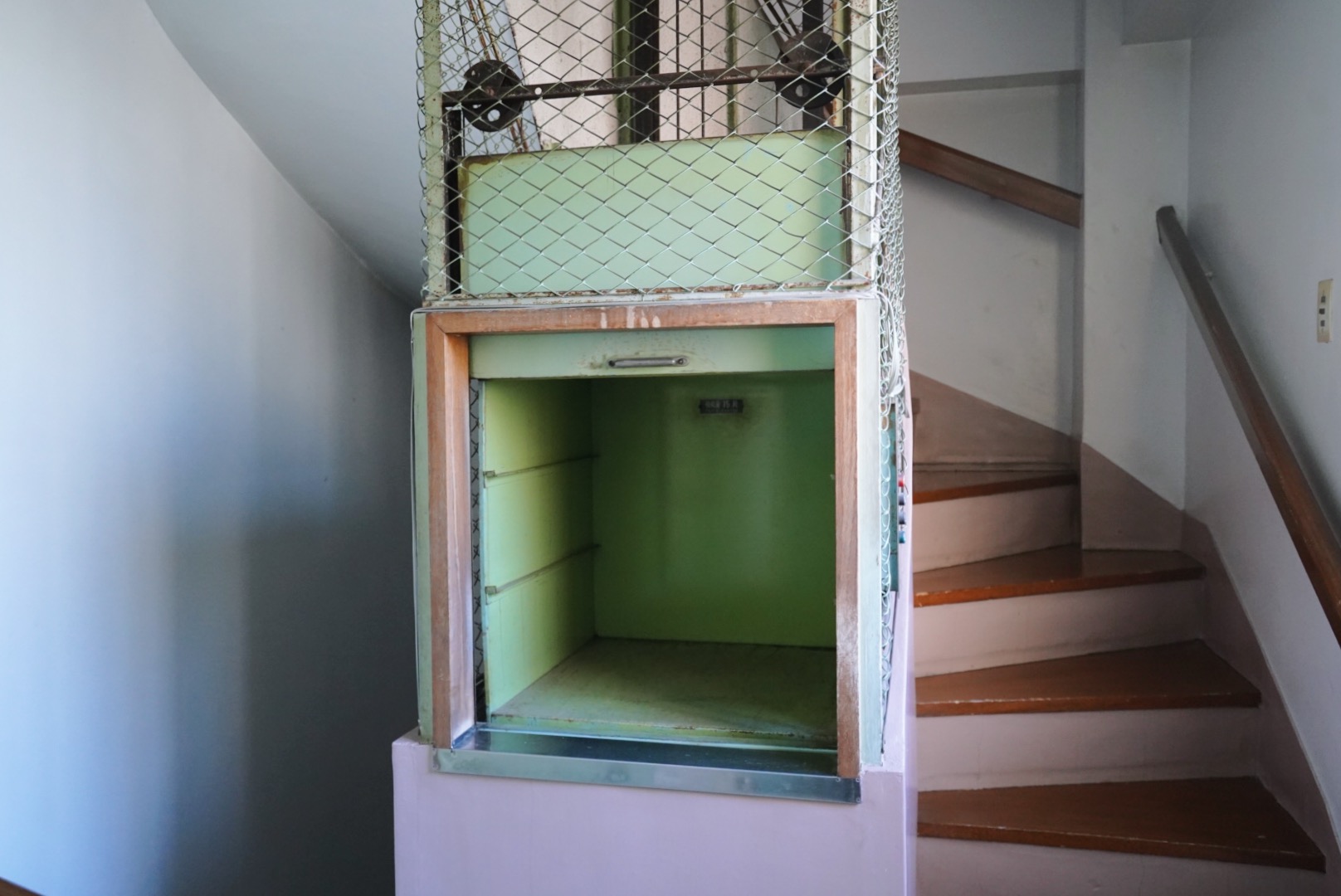 現在は使用することができませんが、廊下にはミニエレベーターがついています。屋上階に洗濯スペースがあるので、着物の肌着や足袋などの洗濯物を運ぶのに使っていたのかもしれません。