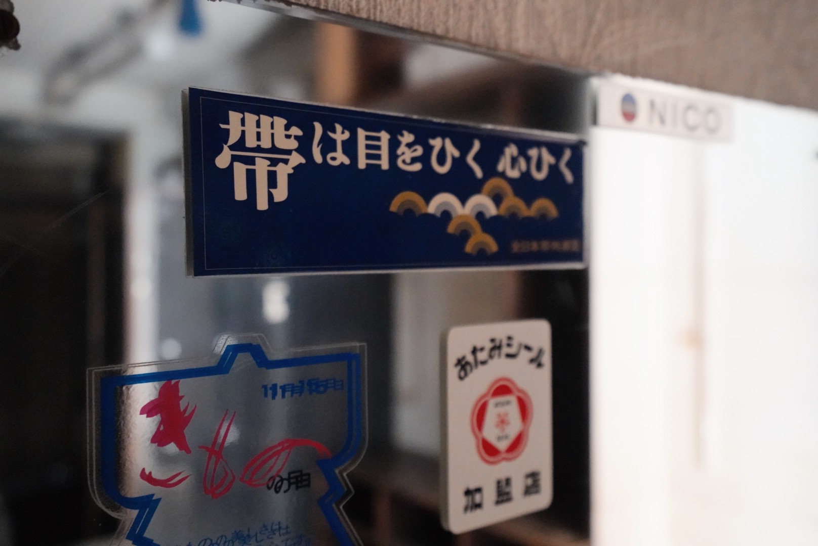 鏡には、呉服屋さんらしい名残を感じるシールがいくつも貼られていました。あえてそのまま残したいですね。