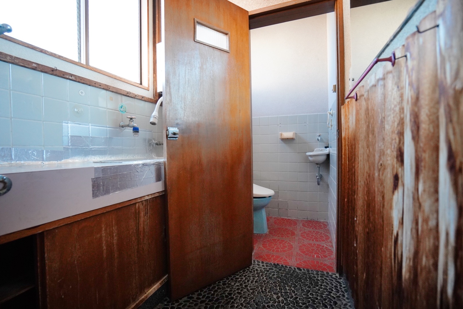 水回りスペースの扉や壁にはいろんな青が使われています。階段の手すり部分のピンクと扉のターコイズブルーも、ときめく配色。