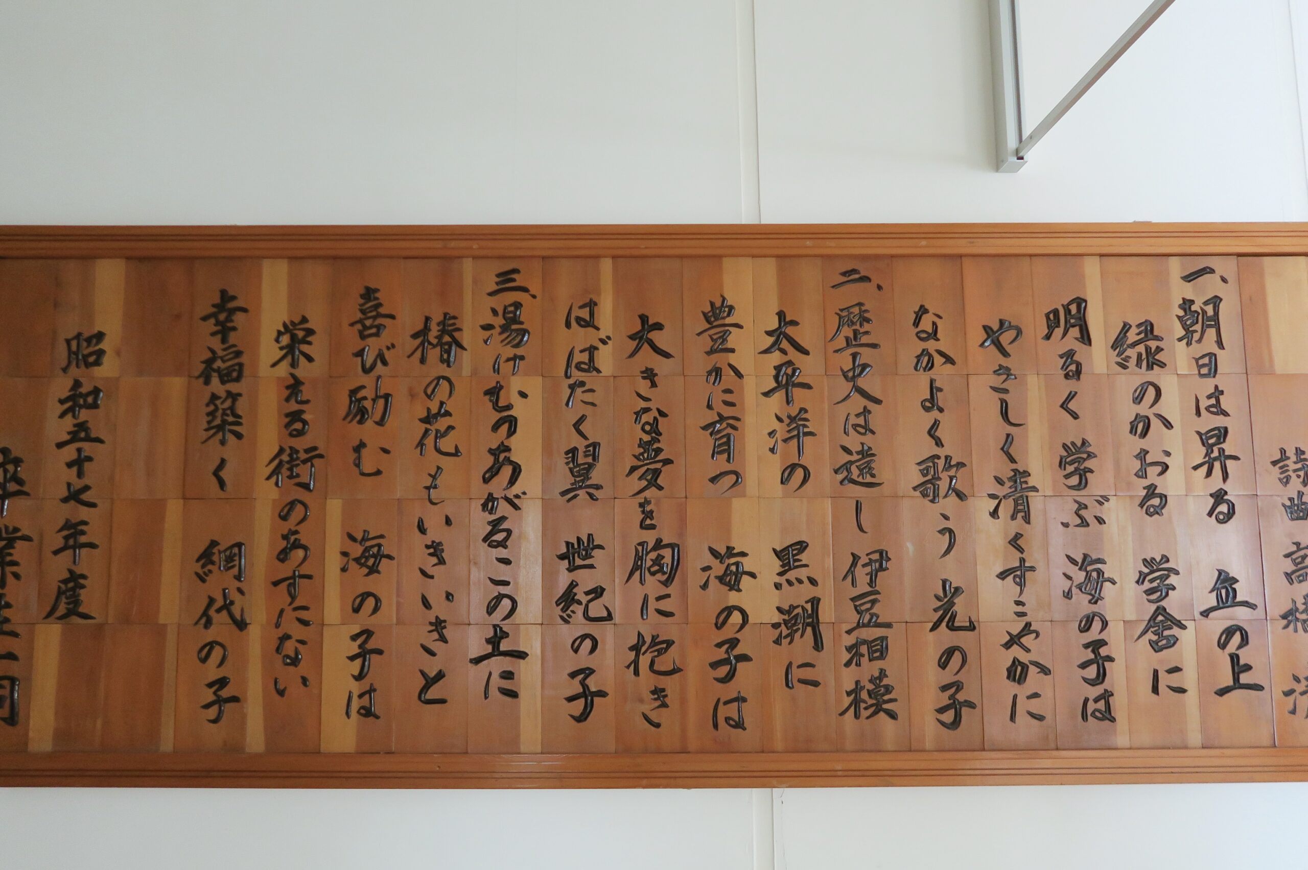 網代小学校の校歌や、卒業生の文集のバックナンバーが利用者の目に留まる場所に展示されています。