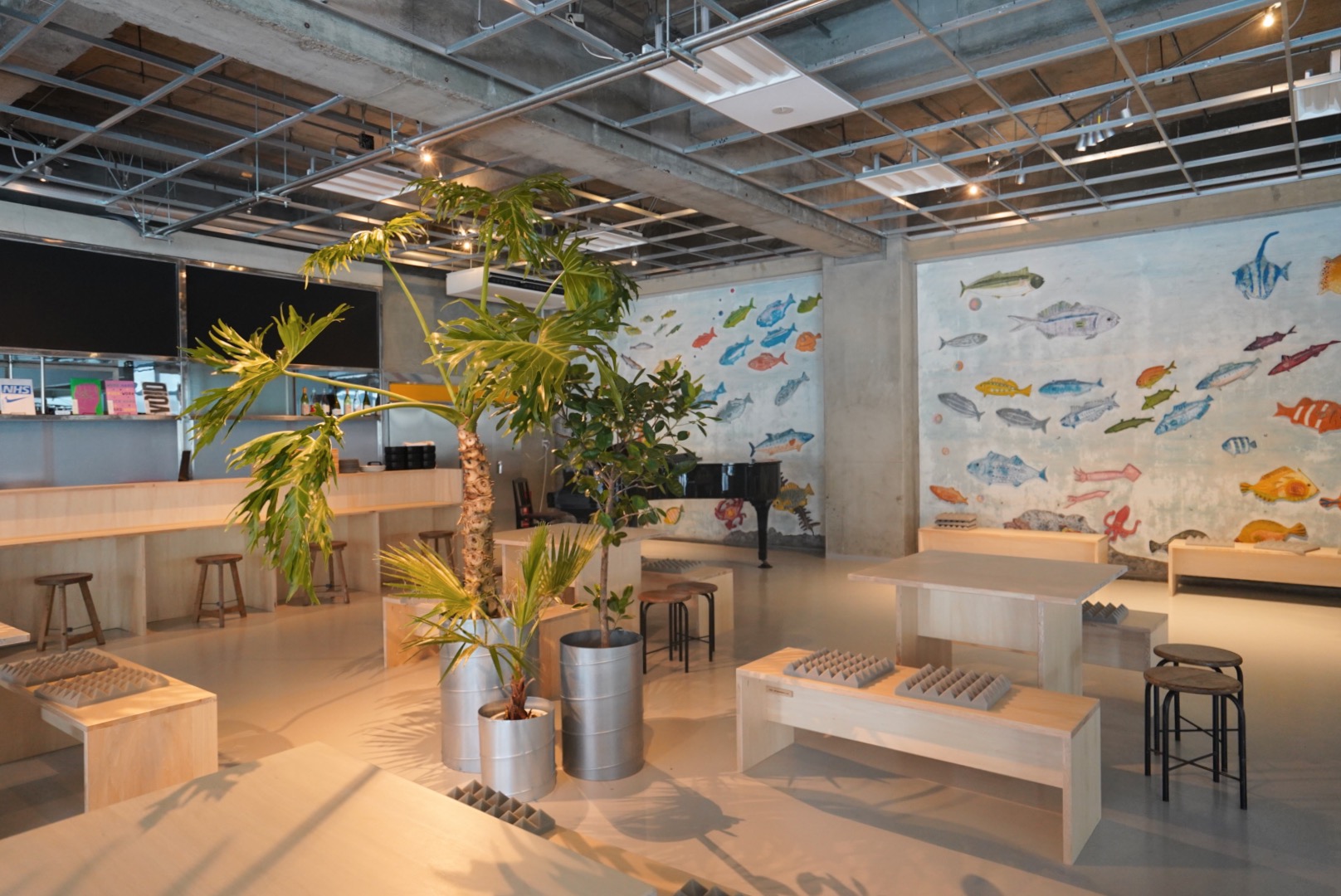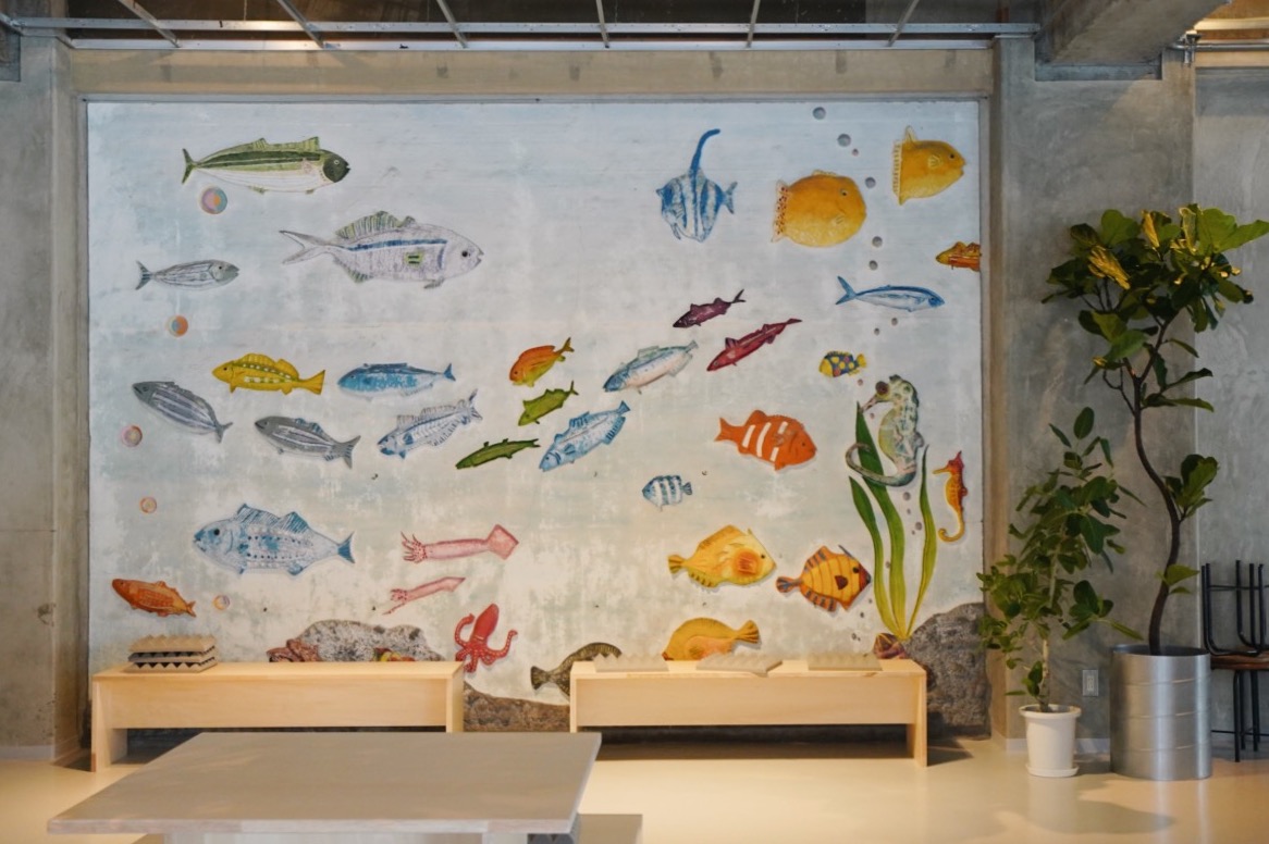 大きな窓から自然光の差し込む開放的な空間では、漁師まち網代らしい、魚の壁画がお出迎え。