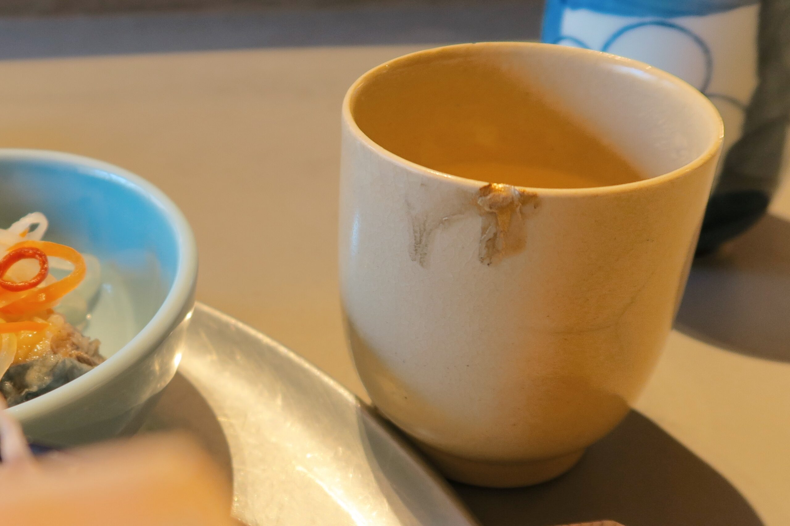 お料理を提供する食器の一部は、ご近所で不要になったものをいただいて使っているそうです。湯呑みのふちに金継ぎの跡を発見して、パシャリ。