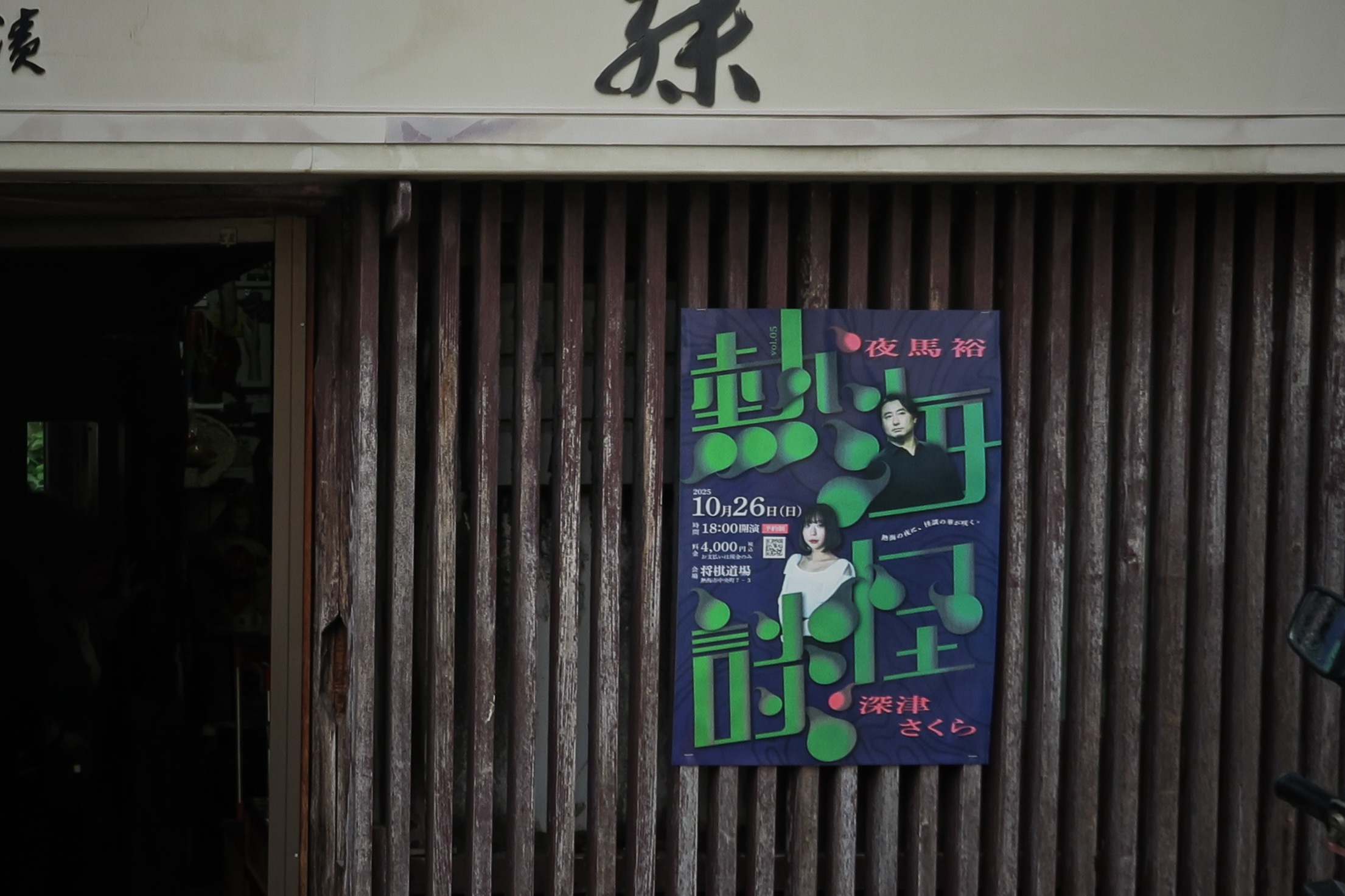 ▲10/26(日)は、中央町に残る妓楼建築「つたや」で開催されたアートイベント。『GLOUND ATAMI 2025』の最終日。つたやの入口にも『熱海怪談』のポスターが貼られていた。ポスター及びフライヤーのデザインは、熱海在住のグラフィックデザイナー maya氏によるもの