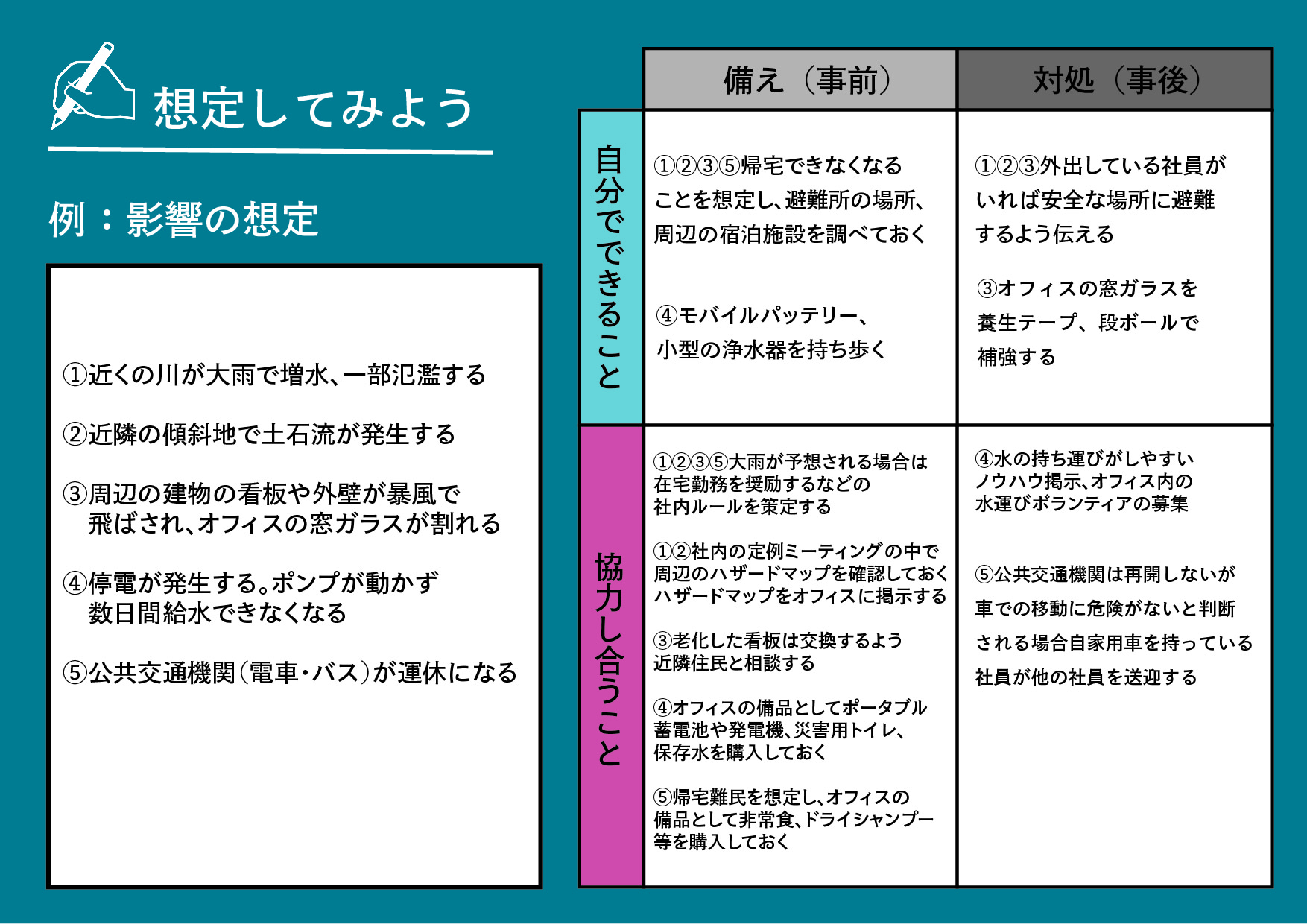 その「3つの特性」を踏まえることで、より抜け・漏れなく災害の影響を想定でき、具体的に対策を考えることができました。