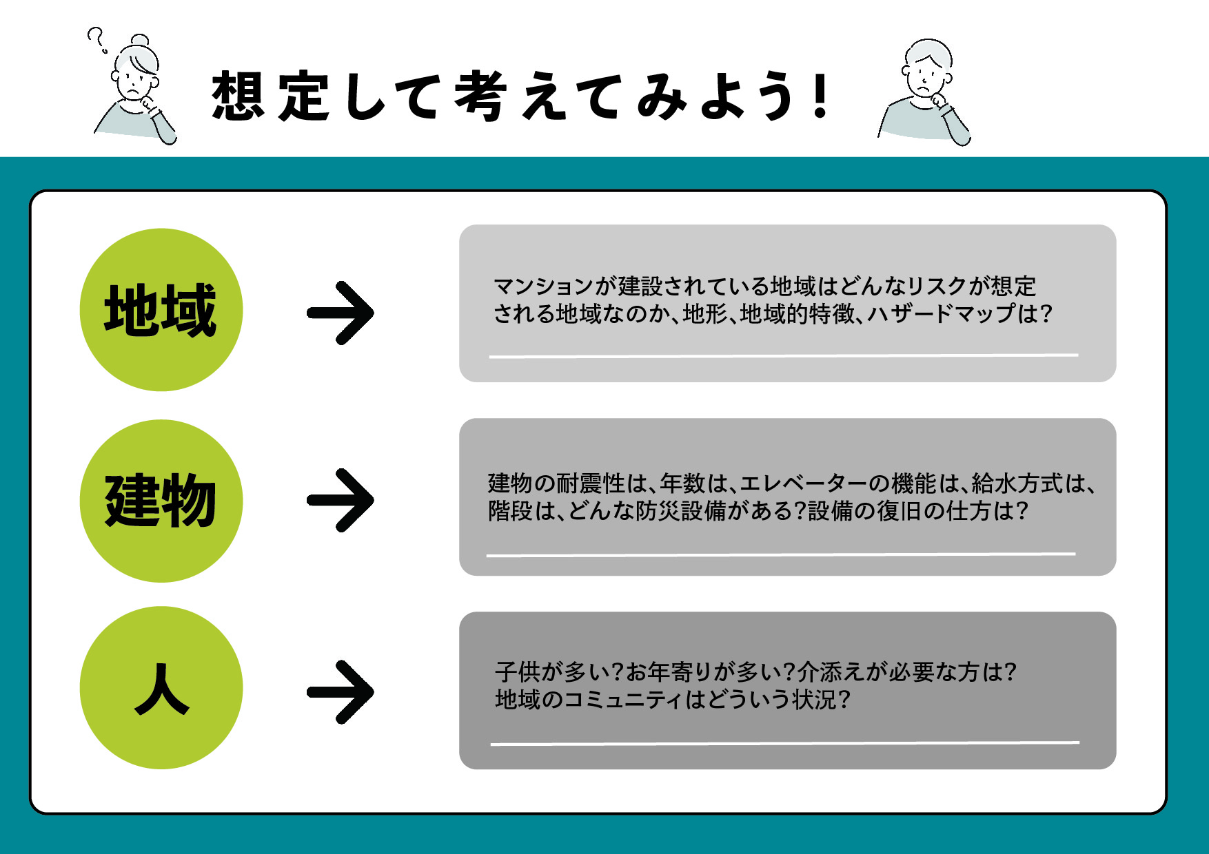 三好「特に住居について考えてみるなら、そのマンションには高齢者や子供が多いか、体の不自由な方がいるか、といったことが利用者特性になります。単独での避難が容易でない人たちが多ければ、それを想定して防災計画を作る必要があるわけです。」
