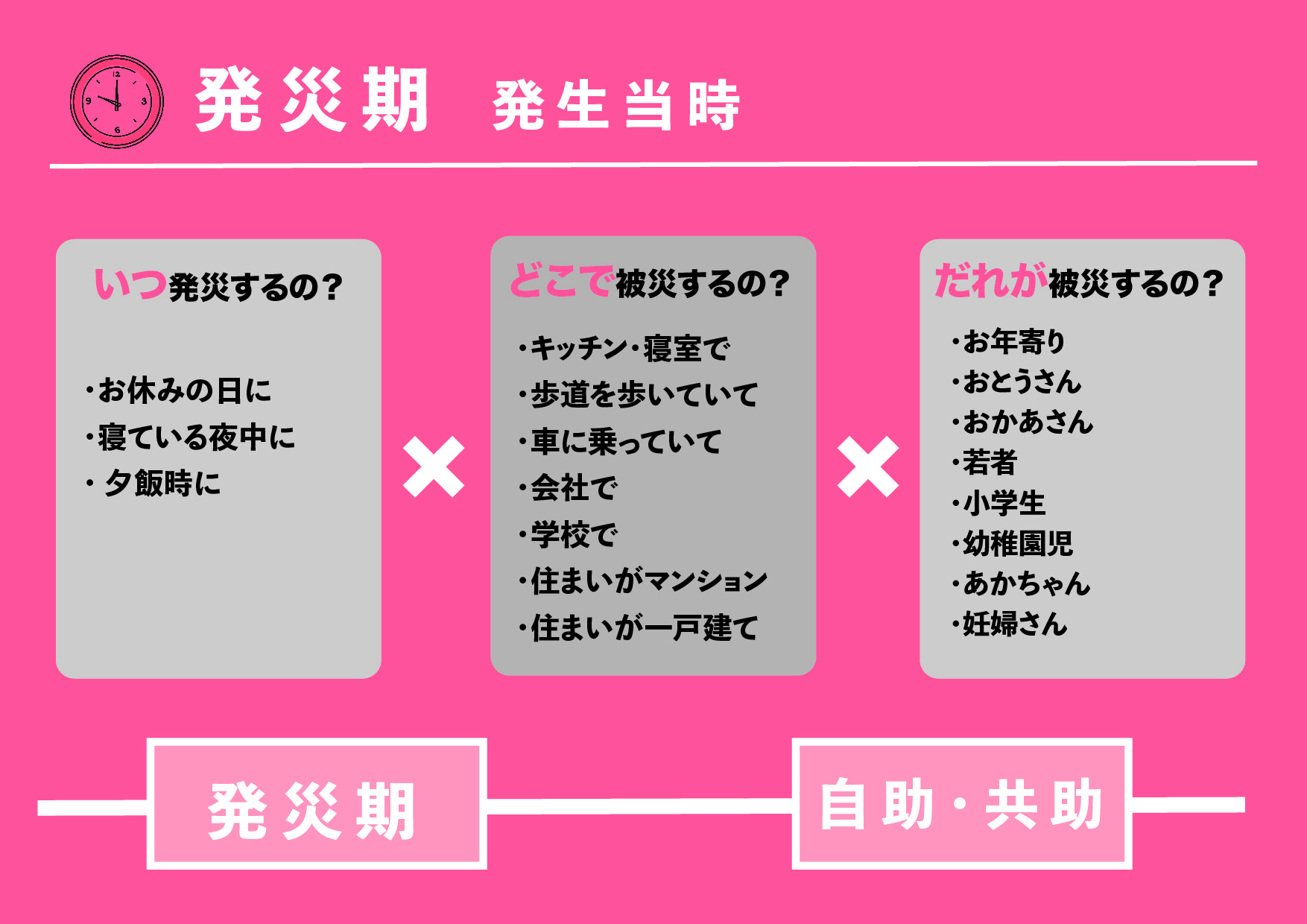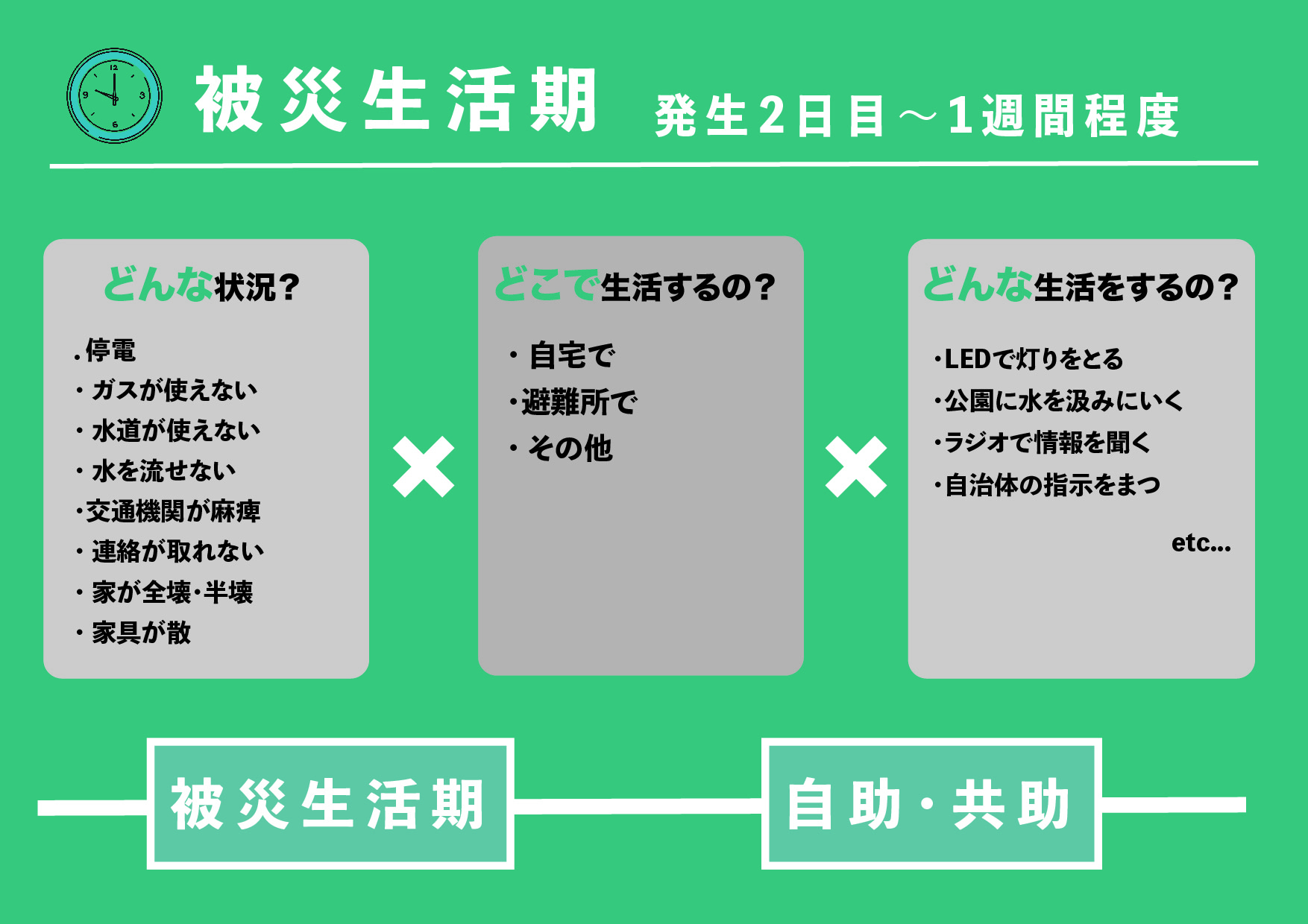 第2回で取り上げた、災害の「3つの期間」に加えて、自分の住んでいる場所、訪れている場所。