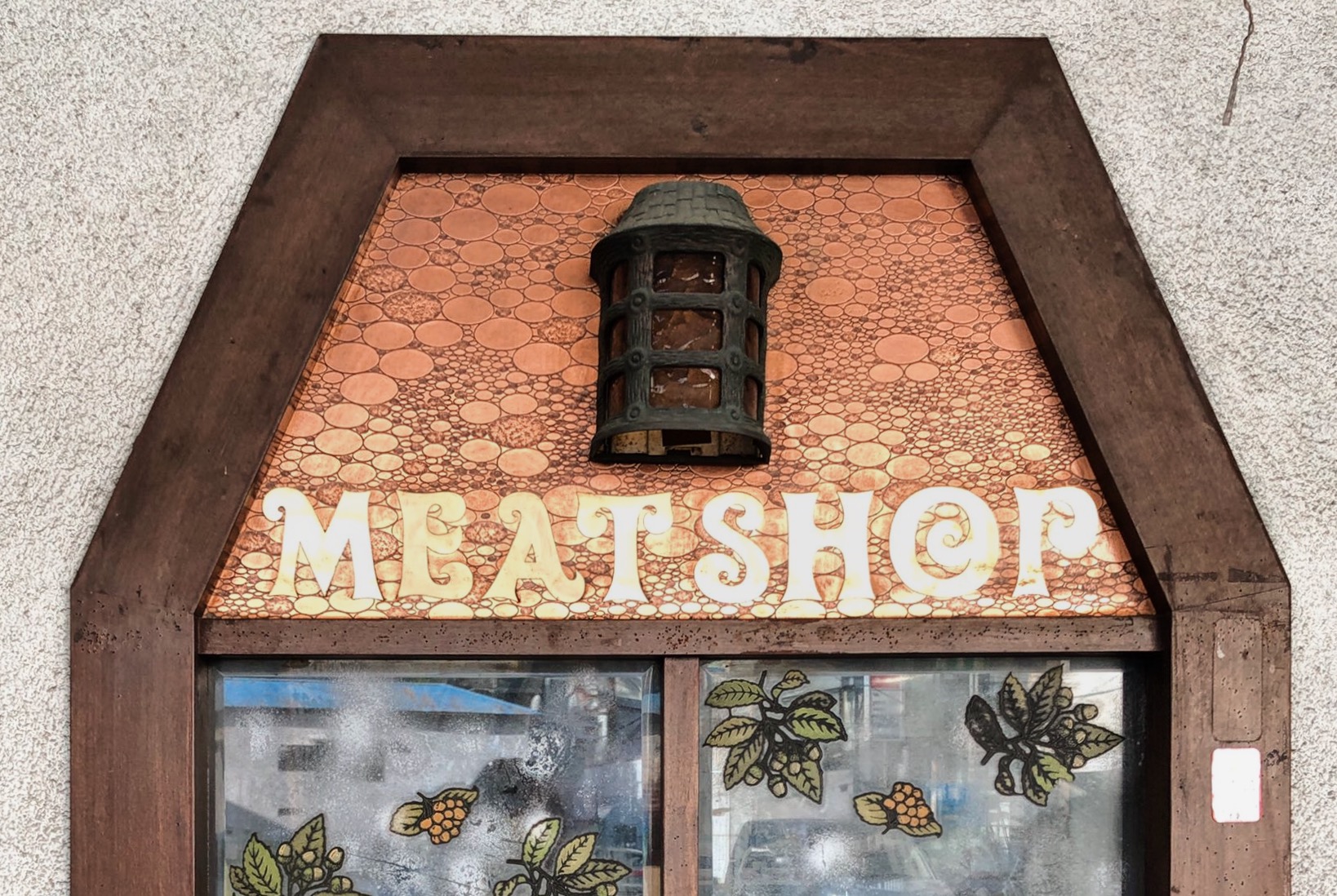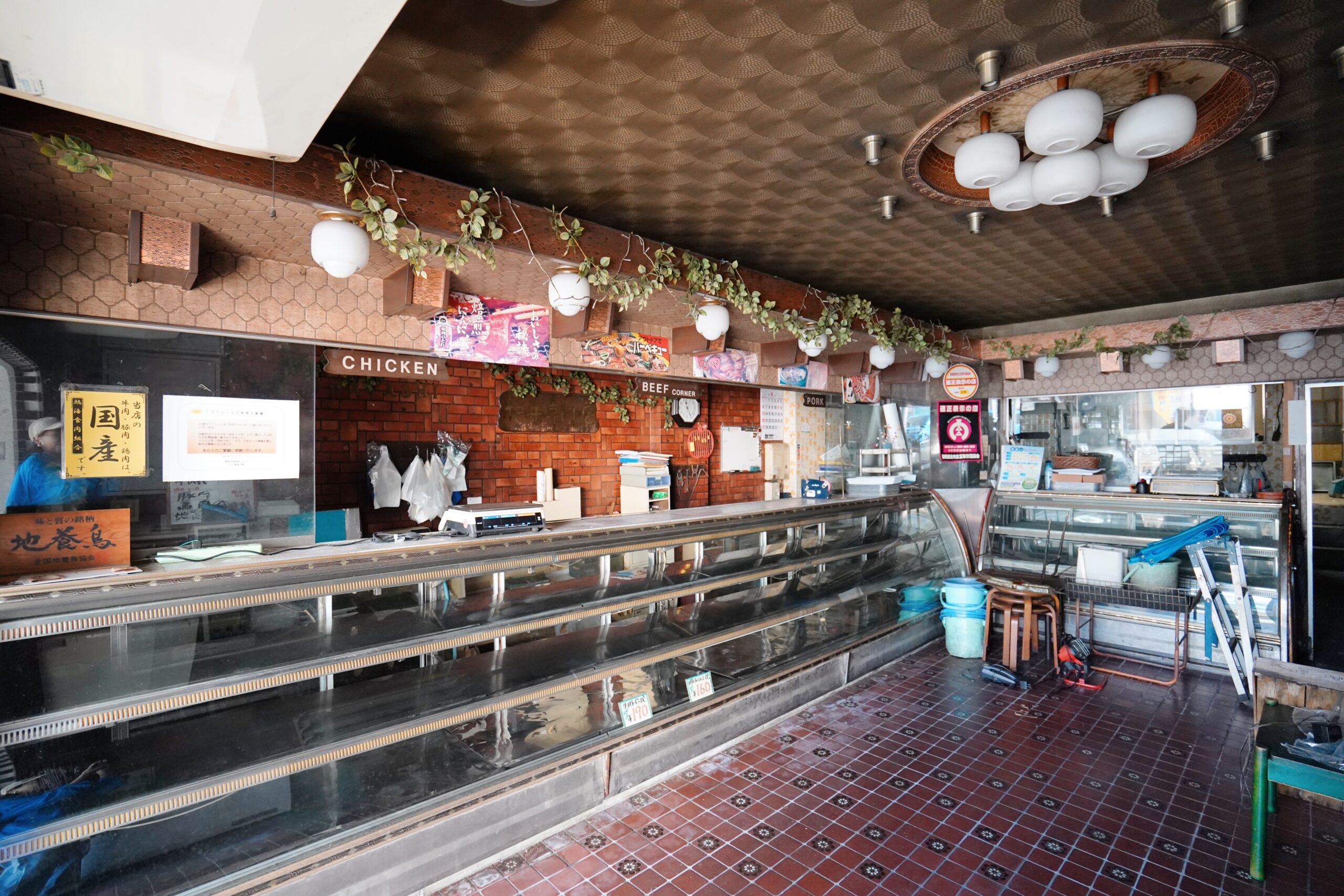 最後に見て回ったのは、古くからの個人商店が立ち並ぶ通りにある元精肉店。什器も内装もそのままの状態で残されており、細部まで作り込まれたデザインに胸が踊ります。