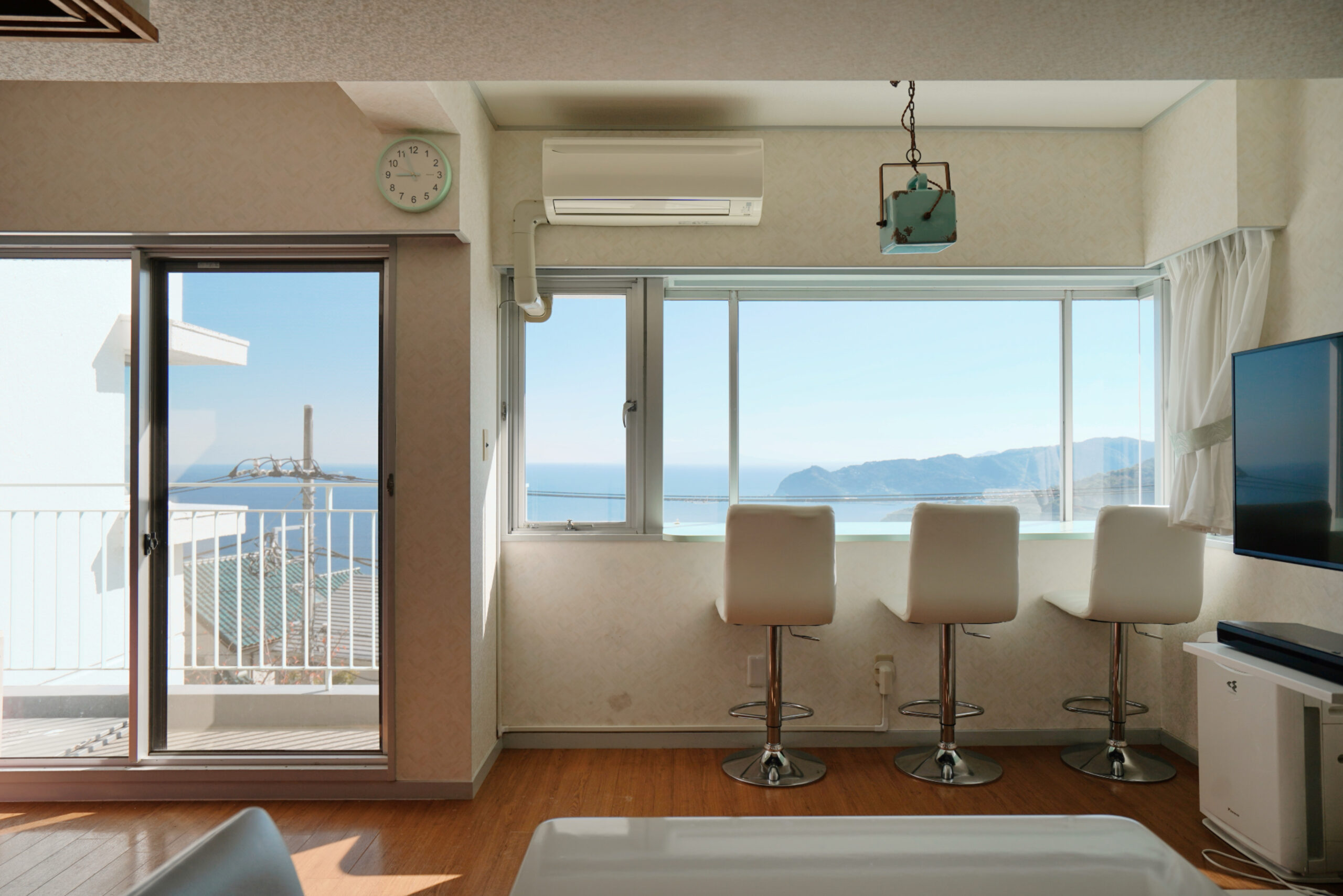 海の見える窓際に、カウンターテーブルと椅子が並んだ一角があるんです。24時間、いつでも好きなときに海が見られるのは、この家主ならではの特権。