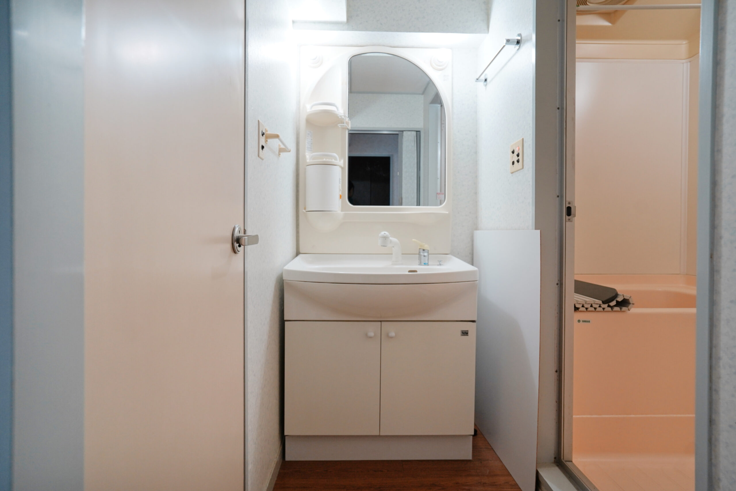 洗面台の鏡が、かまぼこみたいな愛らしいかたちをしているのも推しポイントです。