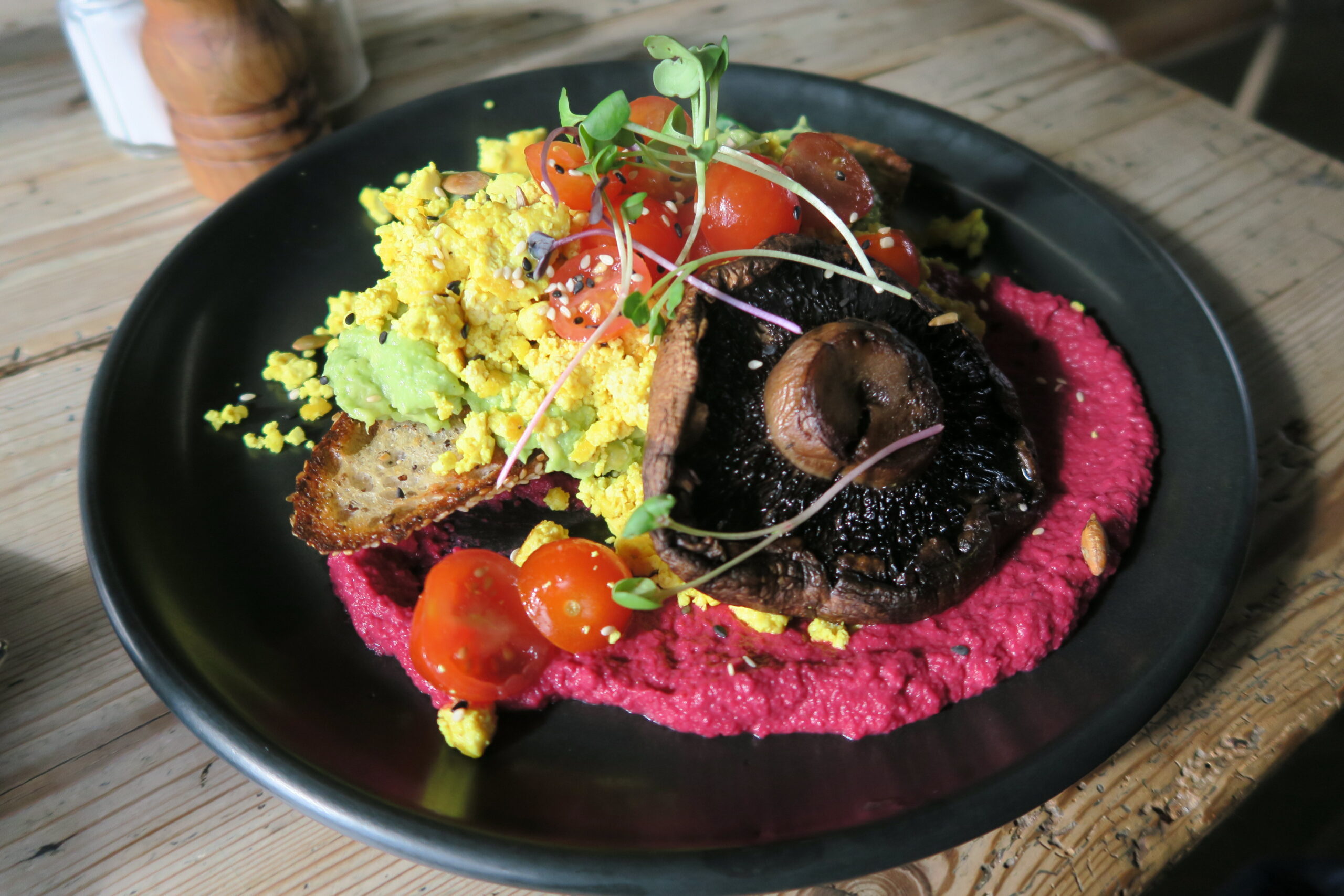 ▲ヴィーガン・ベジタリアン向けの料理が充実しているのも興味深い点。これはウコンで色を付けて卵に似せた「スクランブル豆腐」。