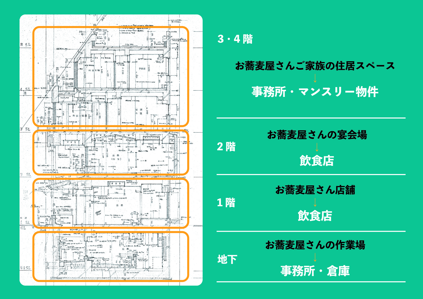 三好「こちらはもともと、お蕎麦屋さんの建物だったんです。当時は1階が店舗、2階が宴会場、地下が作業場。3、4階はお蕎麦屋さんご家族の居住スペースでした。」